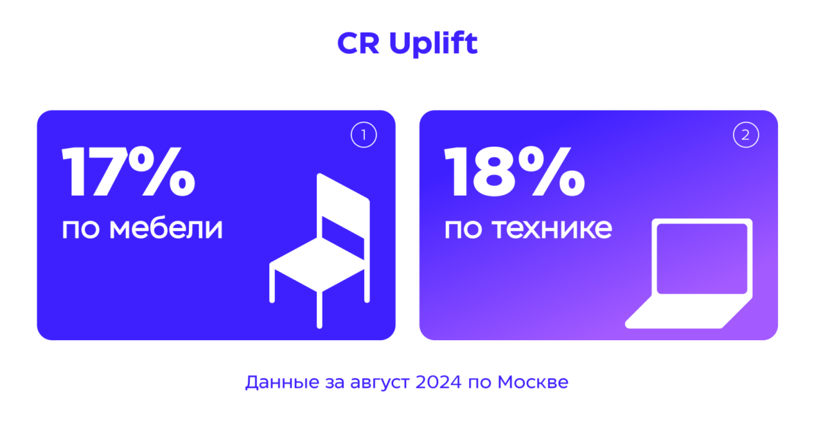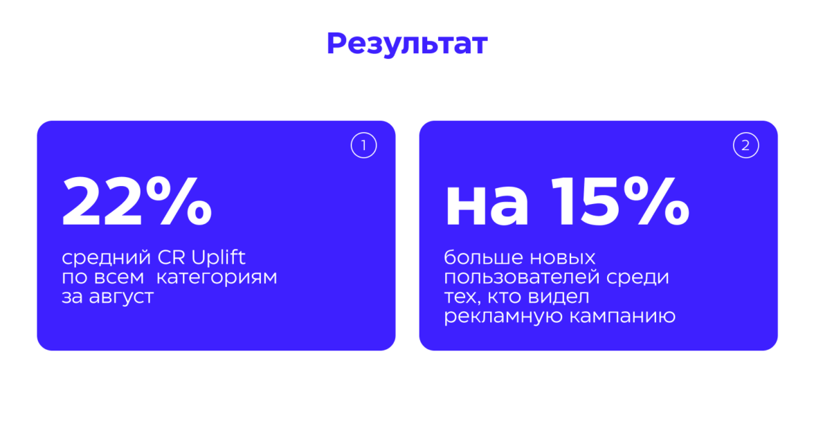 Запускали рекламу по всем категориям товаров: от бутилированной воды до ноутбуков, в баннерах использовали самый разный CTA. Лучше всего отработал креатив с акцией «подарок за первый заказ» — его средний CR Uplift был выше, чем у остальных категорий.