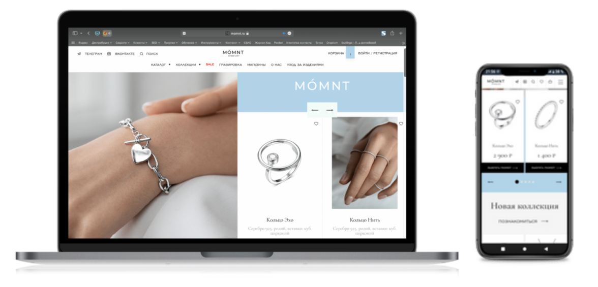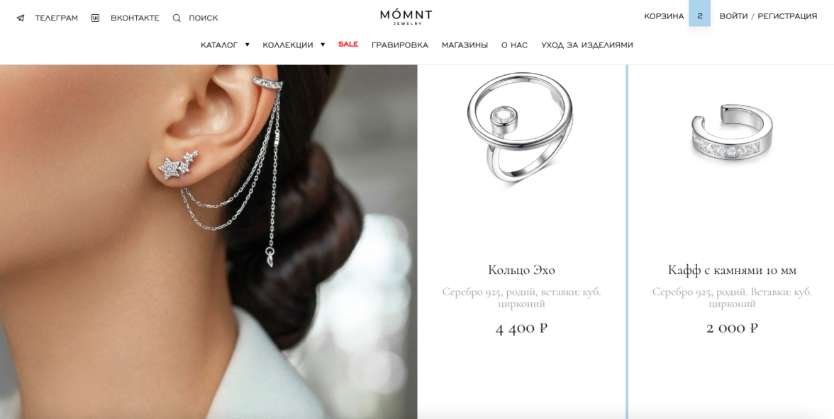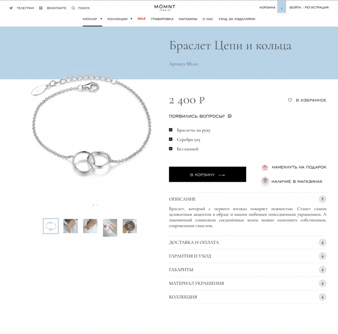 Мы в MediaNation работаем с клиентами из ювелирной тематики уже на протяжении 10 лет и знаем, что продажа ювелирных товаров — процесс, требующий особого внимания на всех этапах привлечения клиента и совершения покупки. Ювелирные украшения — это товар эмоционального спроса. При создании сайта для магазина MOMNT важным нюансом было сочетание двух составляющих в описании украшений — визуальной и текстовой. А одной из необычных деталей стала функция «Намекнуть на подарок» в карточке товара.