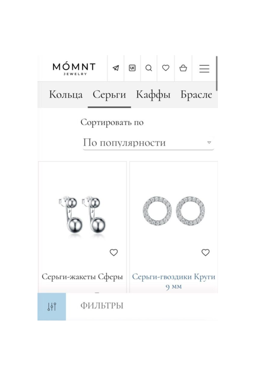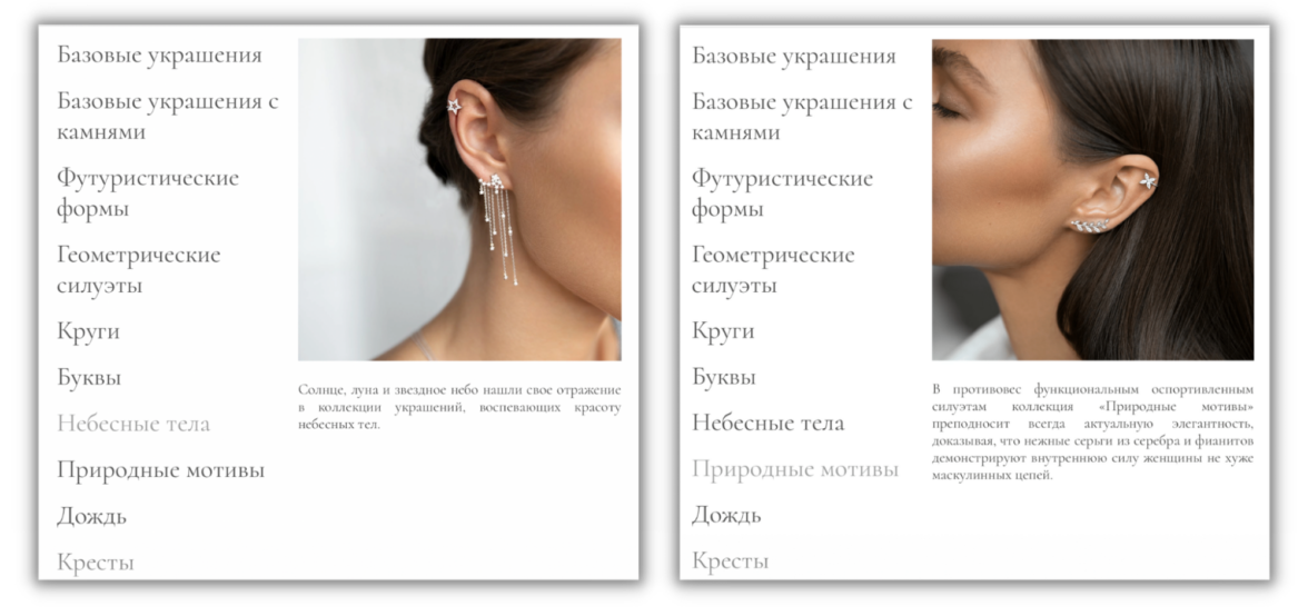 На сайте реализовано 2 каталога — по товарным категориям и по коллекциям украшений, чтобы упростить поиск необходимых товаров, а также вдохновить пользователя на покупку нескольких украшений из одной коллекции.
