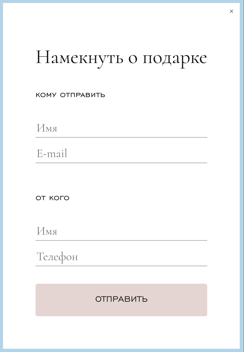 Именно в карточке товара мы реализовали необычную для интернет-магазинов функцию — «Намекнуть на подарок». Через эту форму пользователь может отправить на электронную почту своему партнеру письмо с текстом «Здравствуйте, Иван! Мы знаем, что Аня мечтает о таком подарке из MOMNT, и решили Вам намекнуть об этом» и ссылкой на страницу оформления заказа.