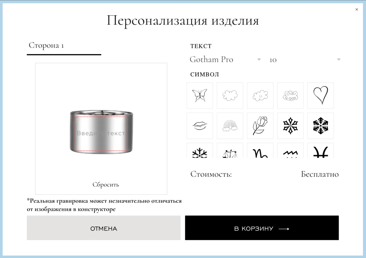 Раздел Гравировка стал еще одним каталогом, где пользователь может выбрать украшения, которое можно персонализировать. В карточки товаров этого каталога мы добавили еще одну кнопку Нанести гравировку. При нажатии этой кнопки открывается конструктор, с помощью которого пользователь составляет свой уникальный дизайн или выбирает предложенный в меню шаблон.