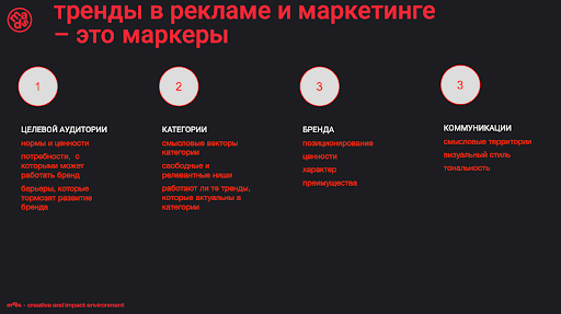 Понимая, что сейчас актуально, можно скорректировать позиционирование бренда, проверить, соответствуют ли ценности, которые транслирует компания, глобальным общественным запросам. Кроме того, тренды влияют на всё, что связано с коммуникацией и смысловыми категориями.