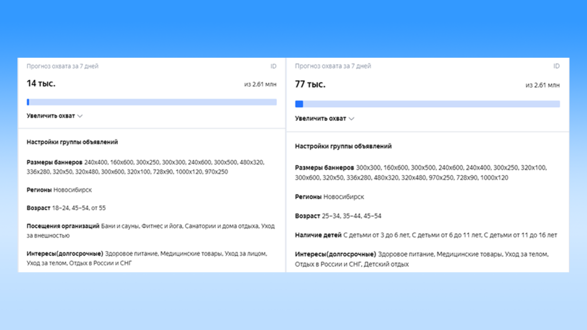 Обе мы запустили на ручном управлении, с условием не более 10-ти показов на пользователя за 3 дня. Регионы показа: Красноярск, Новосибирск, Кемерово и Томск, так как именно эти города показывали лучшие результаты по заявкам и броням в контексте.