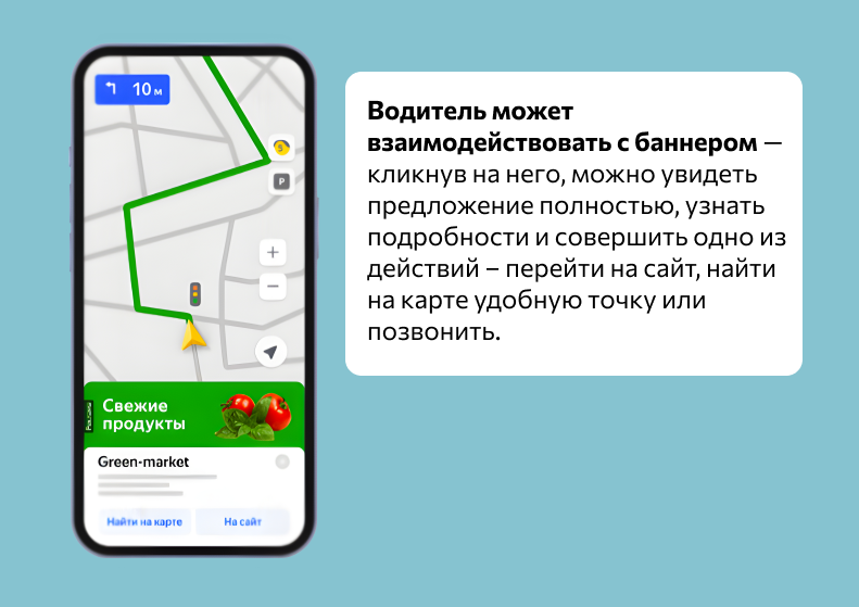 Баннер в Геосервисах — рекламный формат в приложениях Яндекс Карты и Навигатор, который показывается автомобилистам, когда они только планируют маршрут или стоят (например, на светофоре).