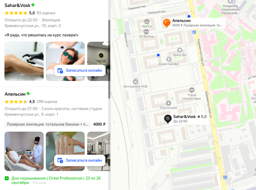 Как мы уже писали выше, приоритетное размещение на геосервисах Яндекса поднимает карточку организации в выдаче. Однако конкуренты тоже могут пользоваться этой услугой.