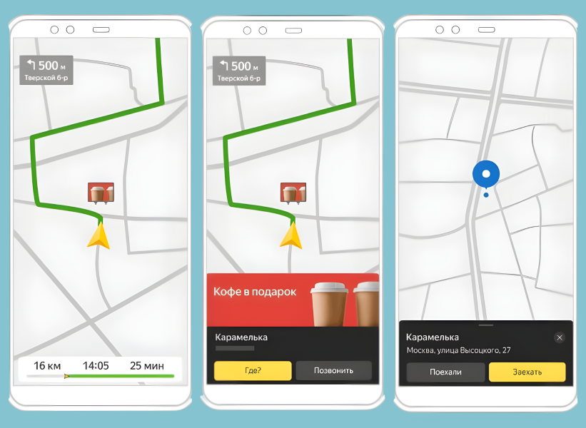 Рекомендация маршрута — пользователь увидит предложение заехать по пути в точку продаж рекламодателя. Реклама появляется еще до начала движения и поэтому позволяет получить дополнительное внимание к бренду и привлечь посетителей в торговые точки бренда.