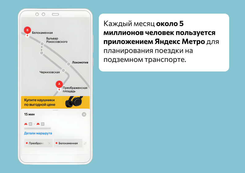 Баннер в Яндекс Метро — позволяет обратиться к мобильной аудитории приложения, рассказать о точках продаж недалеко от станций подземки и повысить узнаваемость бренда.