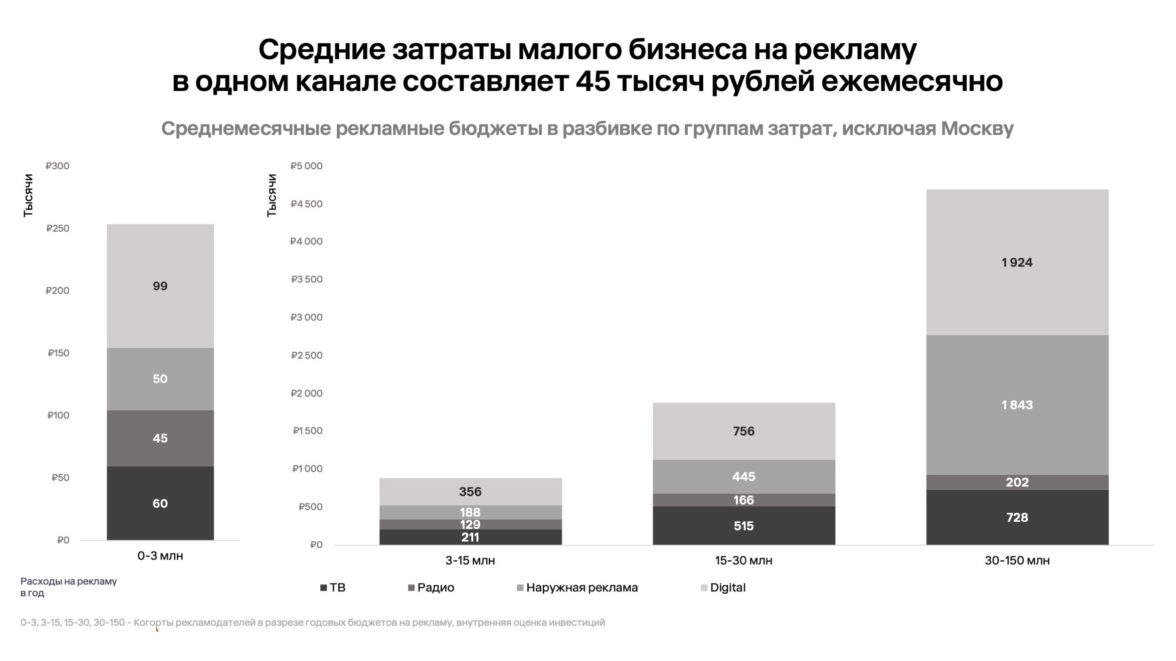 Перед запуском сервиса медиапланирования SAMBA группа Okkam провела количественное и качественное исследование о продвижении малого и среднего бизнеса в регионах. Как показал анализ, за пределами Москвы digital является основным каналом в медиамиксе малого бизнеса. Его доля у компаний с годовыми бюджетами до 3 млн рублей составляет 47%, тогда как на OOH приходится 24% инвестиций, на ТВ — 17%, а на радио — 13%. Однако по мере увеличения затрат на рекламу увеличивается и вклад офлайн-медиа. У компаний с бюджетами от 30 до 150 млн рублей доля digital сжимается до 42%, зато доля наружки составляет 30%, ТВ — 25%.