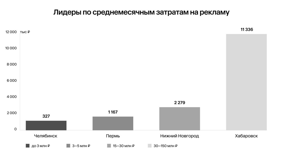 В группе с годовыми бюджетами до 3 млн рублей самые высокие среднемесячные затраты на рекламу — у челябинских предпринимателей, в группе 3–15 млн рублей лидирует Пермь, в группе 15–30 млн рублей — Нижний Новгород, в группе 30–150 млн рублей выделяется Хабаровск.