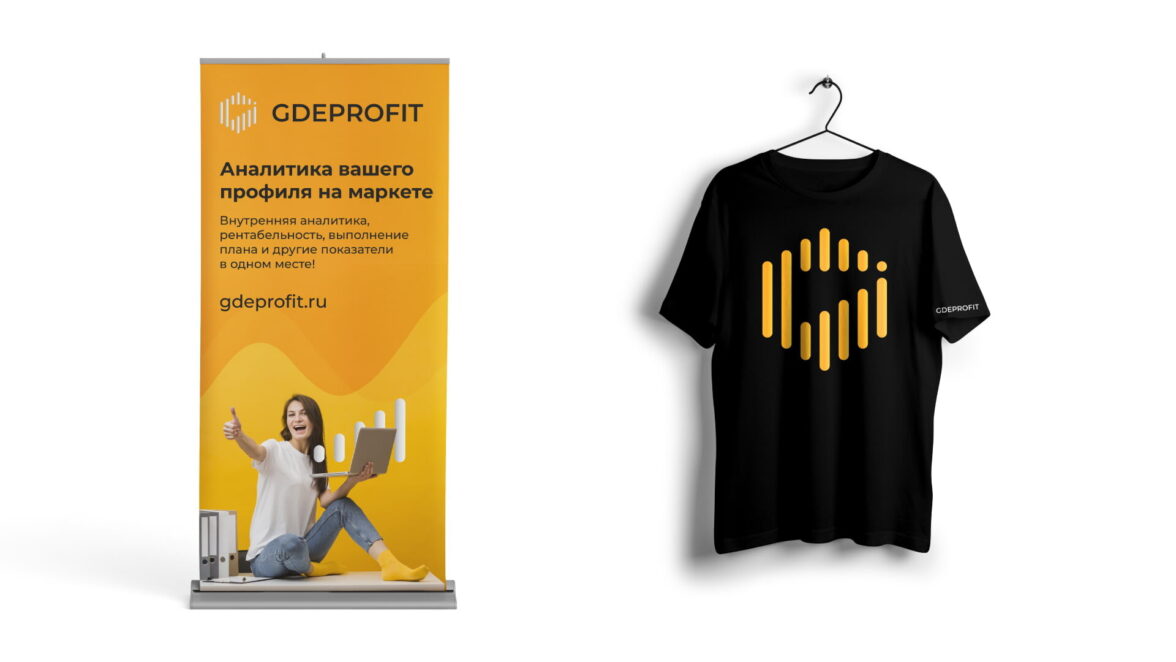 GDEPROFIT — это онлайн проект, но мы разработали физические носители: яркие баннеры, чтобы компания запоминалась на конференциях и фирменные футболки для сотрудников, чтобы их можно было легко узнать в толпе.