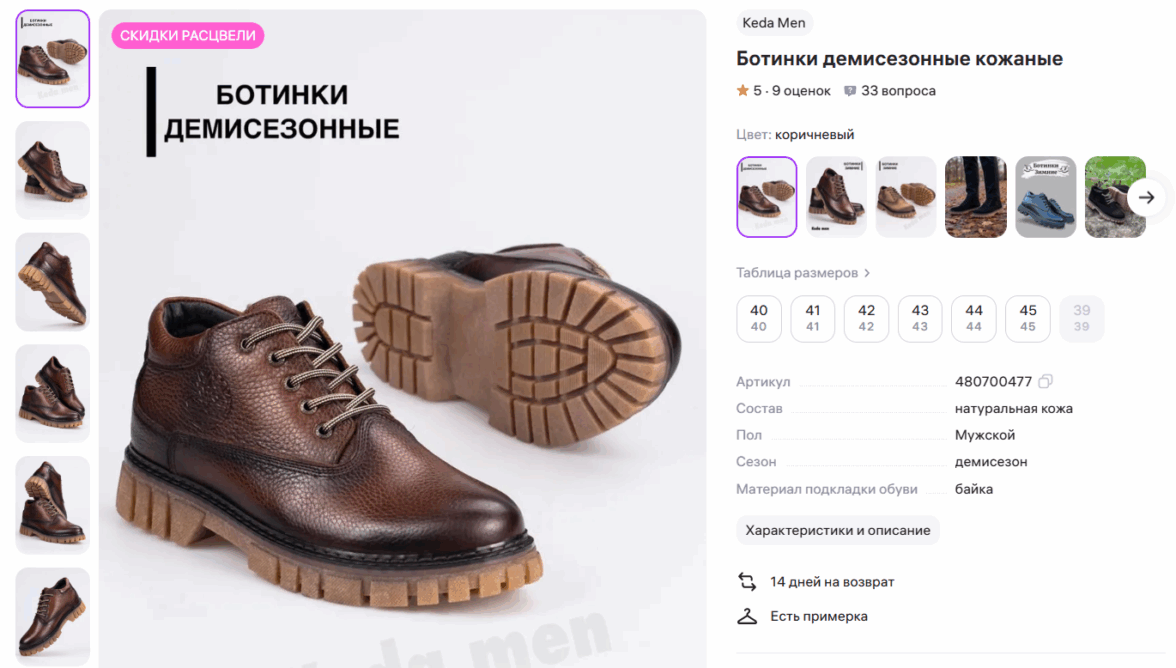 Для отдельных категорий особенно важна детальная съемка: например, при выборе обуви покупатели внимательно смотрят на швы, подошву и другие детали. Если товар включает несколько элементов, их удобно показать с помощью карусели изображений.