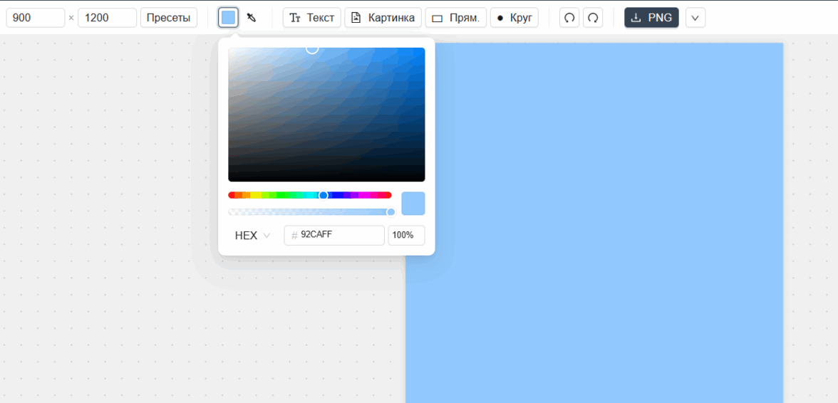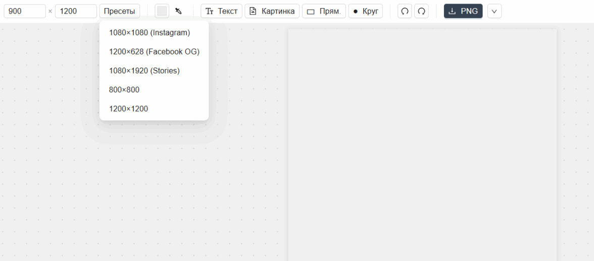 Вы можете задать собственные значения или воспользоваться готовыми пресетами размеров холста. Для создания изображений карточек на маркетплейсах рекомендуется использовать такие форматы: для Wildberries и Ozon — 900×1200, для Яндекс Маркета — 1040×1440.