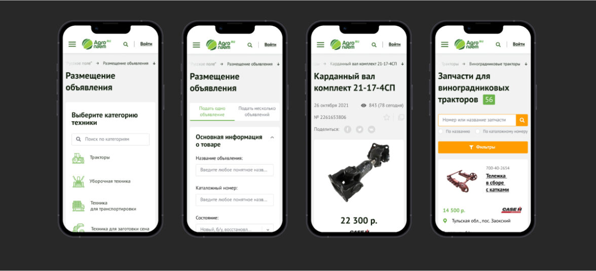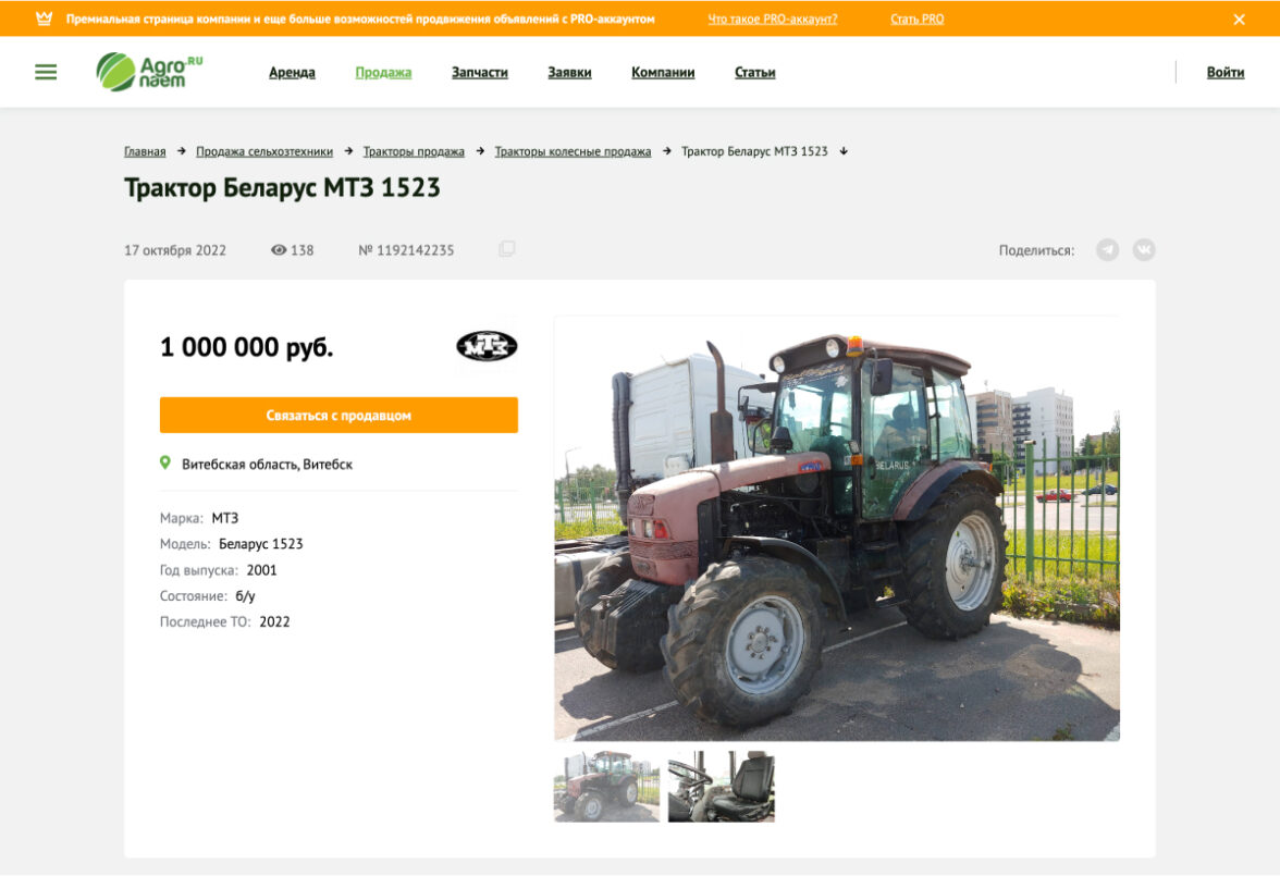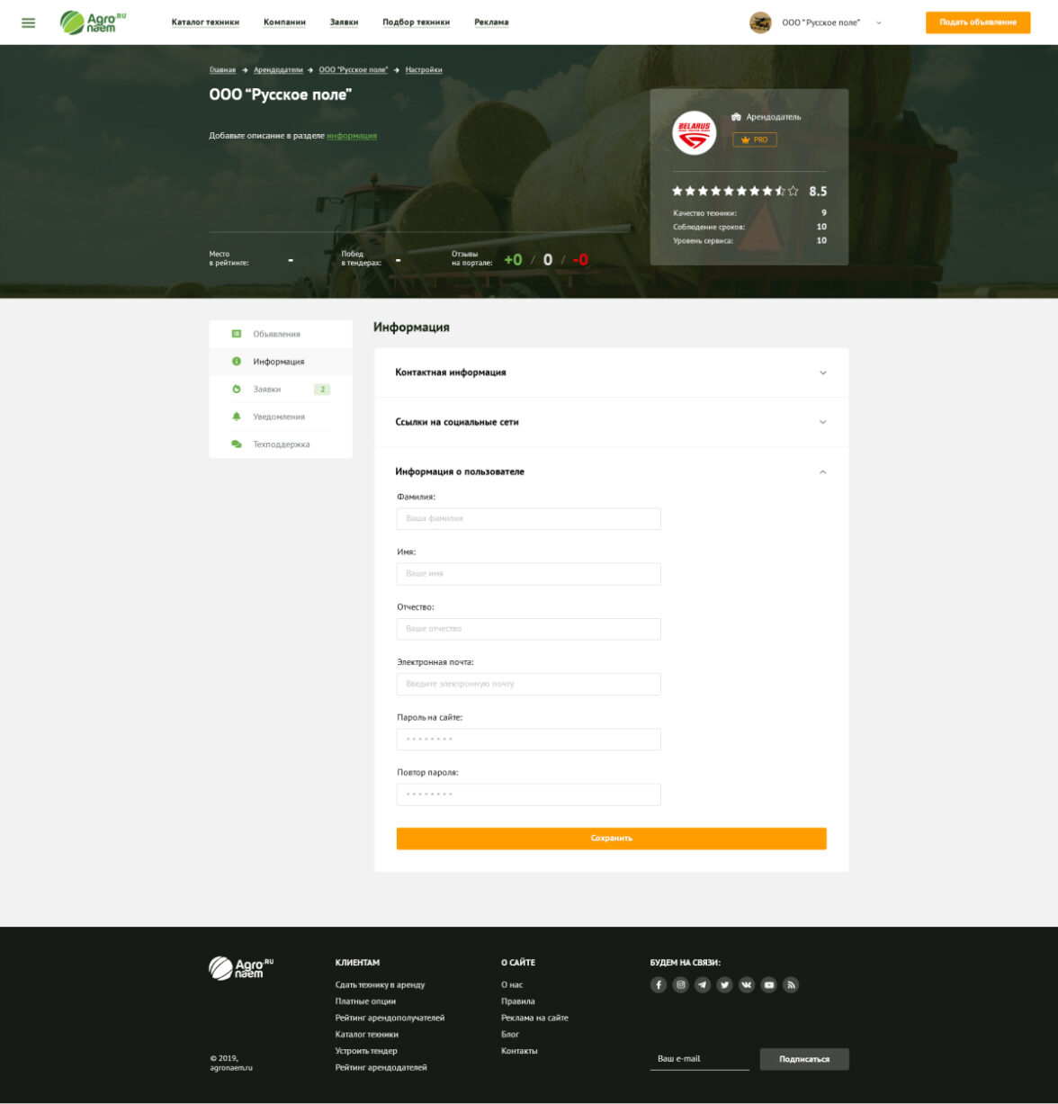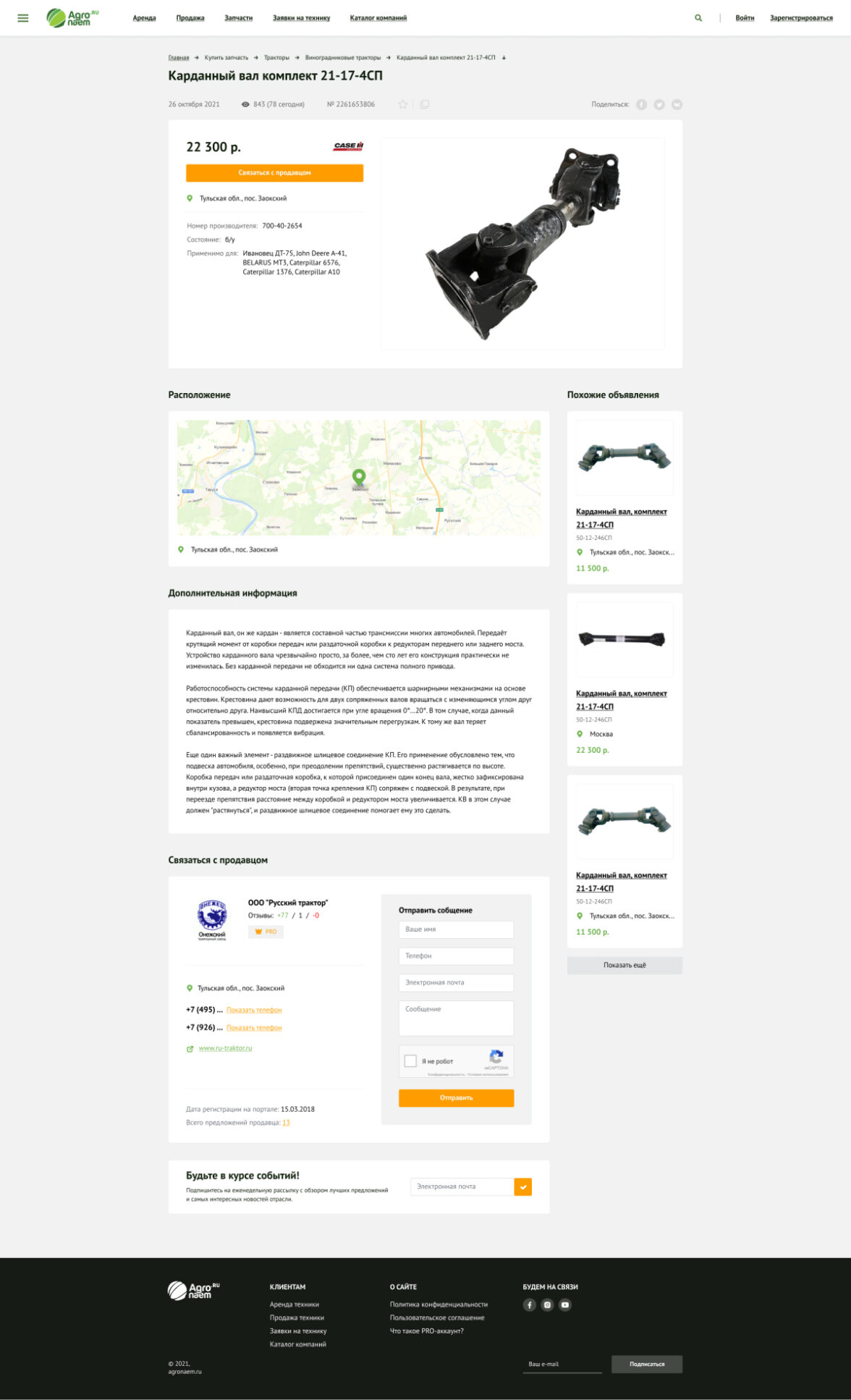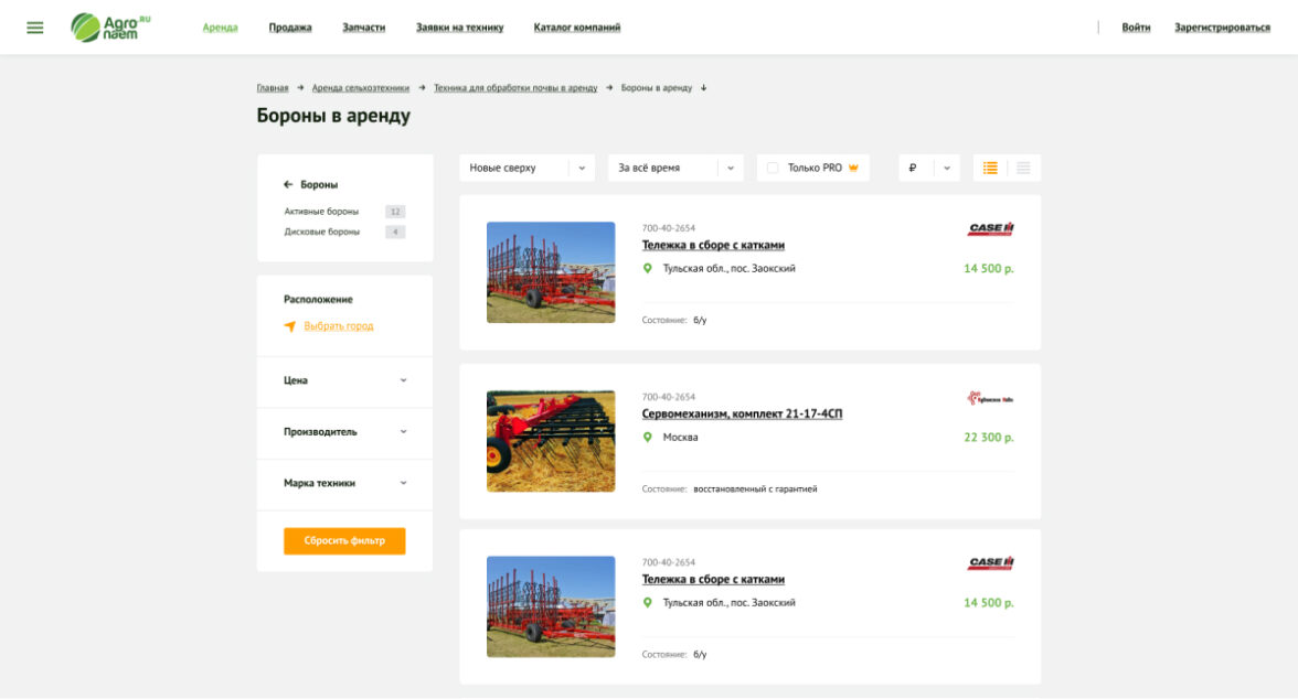 Удобно покупать сельхозтехнику за счет продуманного каталога и рубрикатора, брать в аренду с последующим выкупом, заказывать услуги, создавать заявки (тендеры) на проведение с/х работ