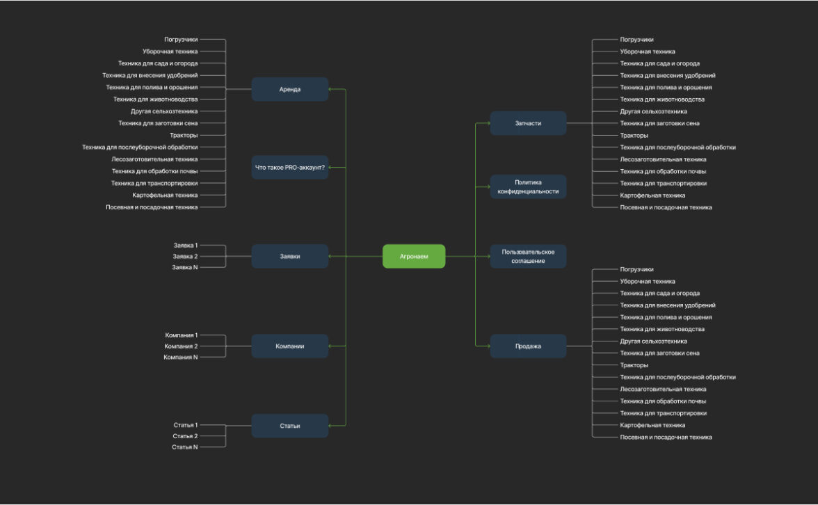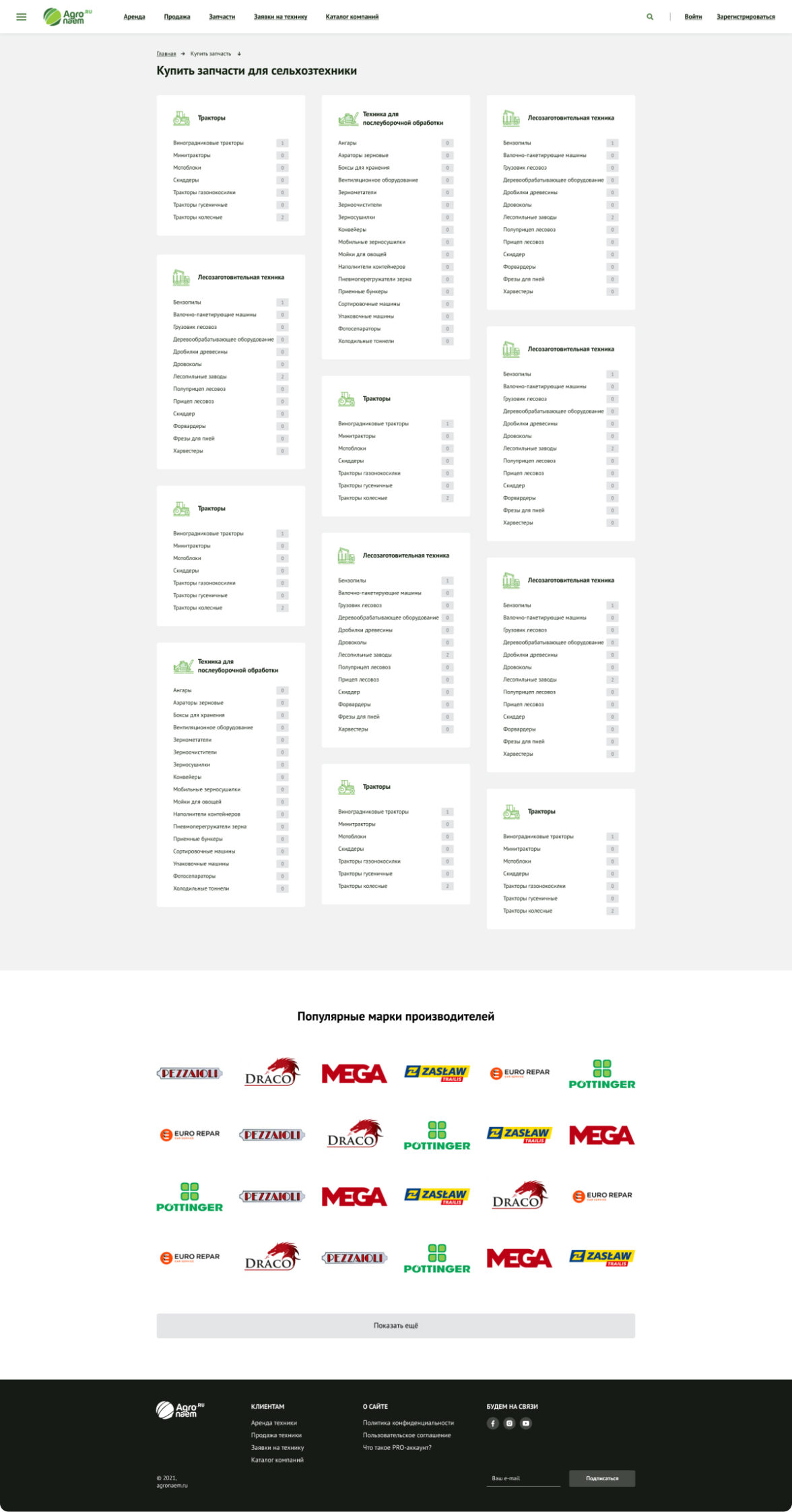 Детальная проработка категорий каталога с 3 уровнями вложенности. Учитываются все специфические параметры сельхозтехники в зависимости от ее типа для удобства поиска, фильтрации техники