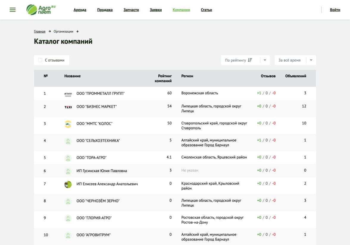 Раздел, где отображаются все компании, зарегистрированные на портале. По результатам сотрудничества компании оставляют отзывы друг о друге, благодаря чему формируется их рейтинг.