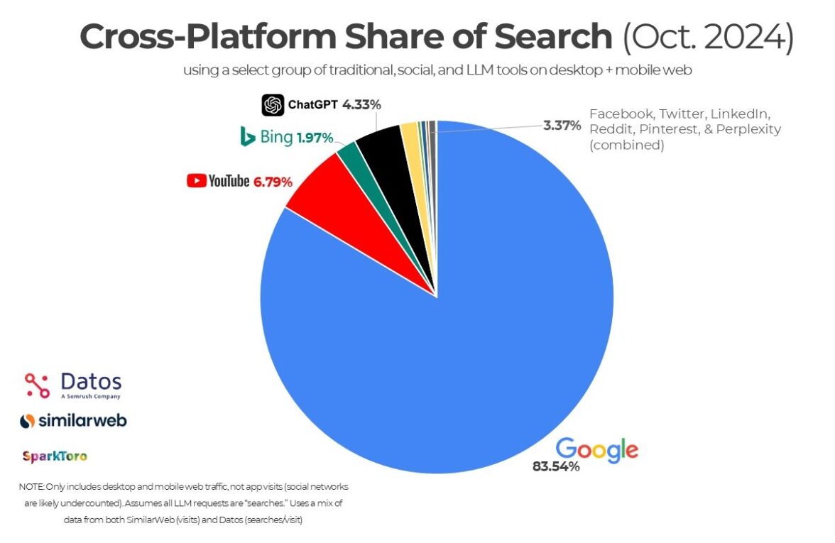 Сейчас по кроссплатформенным данным от SimilarWeb и Datos, у ChatGPT 4,33% от поиска по всем сервисам. У Google — 83,54%, а у YouTube, также входящей в империю Alphabet — 6,79%. У майкрософтовского поисковика Bing — 1,9%. Совокупная доля остальных социальных сетей и платформ составляет 3,37%.