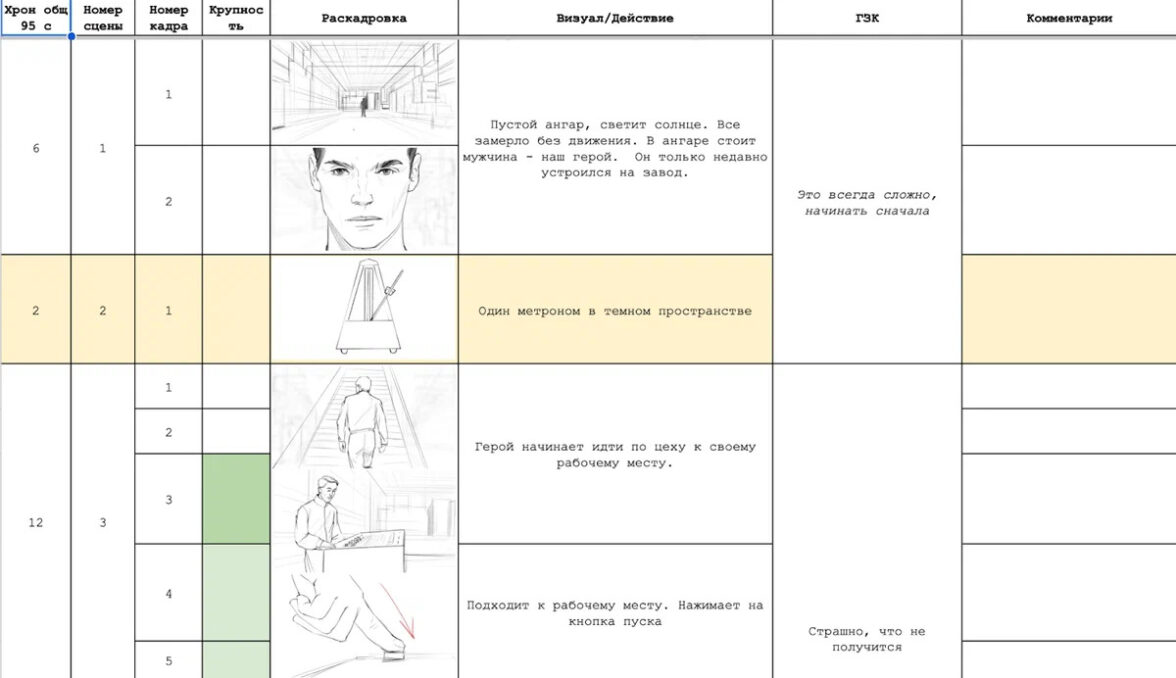 Сценарий уже на первом этапе был практически готов в своей окончательной версии. Однако, после проведения онлайн- и офлайн-скаутинга на производстве клиента, сценаристу вместе с иллюстратором пришлось внести несколько изменений.