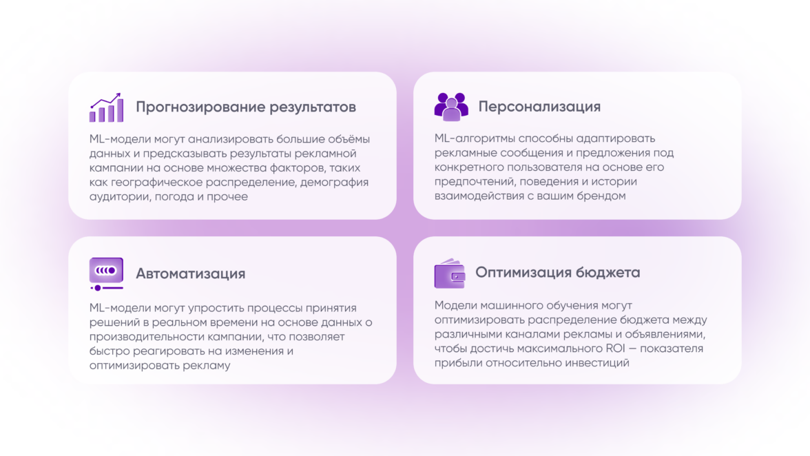 Прогнозирование результатов. ML-модели могут анализировать большие объёмы данных и предсказывать результаты рекламной кампании на основе множества факторов, таких как географическое распределение, демография аудитории, погода и прочее;