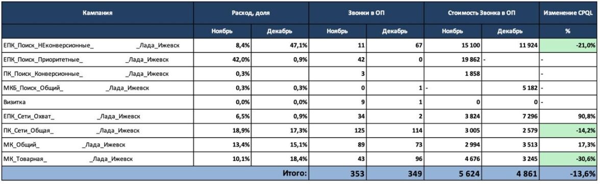 Отключение «Охватной» РК и перевод «Общей» в РСЯ на новую модель оплаты дали положительный эффект. Расход по данному направлению удалось сократить почти на 40%, а эффективность — улучшить. Средняя стоимость звонка в отдел продаж с обеих кампаний снизилась на 17%.