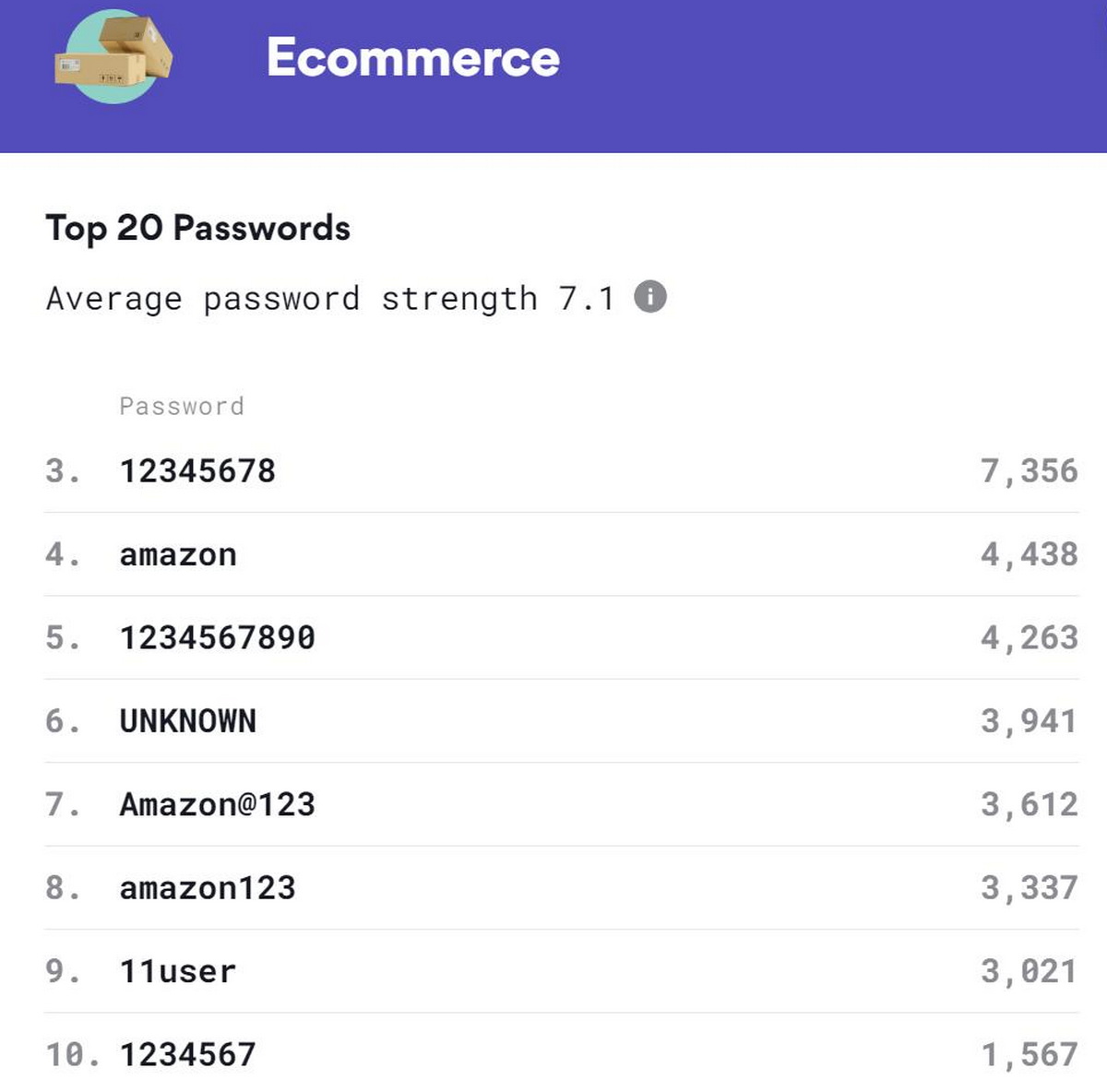 В каждой из групп существуют свои характерные пароли. В «Электронной коммерции» четыре строчки из двадцати заняли пароли, содержащие слово amazon, а последнюю – aliexpress. У пользователей финансовых приложений популярны пароли со словом Paypal и Visa. В лидерах у геймеров оказался пароль, содержащий название игры, – Minecraft. Смартфоны чаще всего защищают с помощью слов Apple, Iphone и Samsung, а поклонникам онлайн-кинотеатров нравятся названия Netflix и Disney.