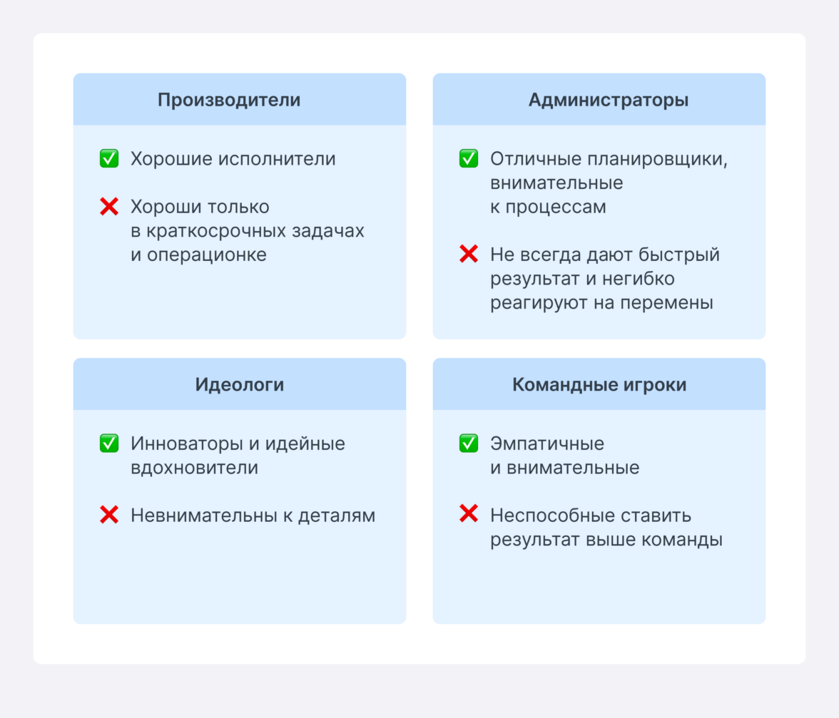 В менеджменте есть подход, который делит всех сотрудников на четыре типа: идеологи, администраторы, производители и командные игроки. Когда распределяете зоны ответственности, убедитесь, что они совпадают с личностью сотрудника и его сильными и слабыми сторонами.
