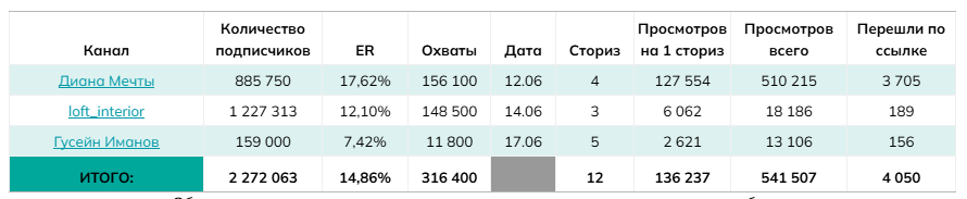 Мы выбрали и протестировали три канала: микроинфлюэнсер, блогер со средним охватом (от 100 000 до 500 000 подписчиков) и канал с направлением в недвижимость (можно отнести к макроблогерам).