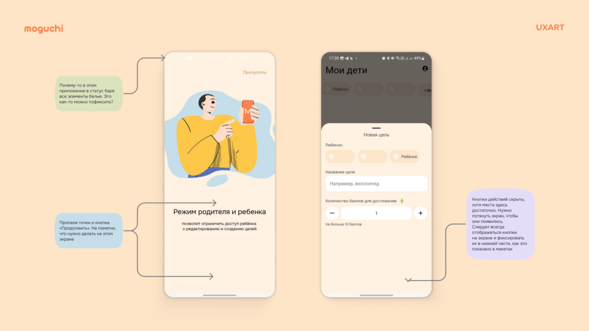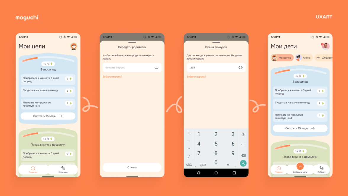 Прямо сейчас Могучи активно разрабатывается и обрастает новым функционал. На сегодняшний день взаимодействие родителя и ребенка происходит в рамках одного приложения на телефоне. Для смены аккаунта использовали систему родительского контроля с пин-кодом.
