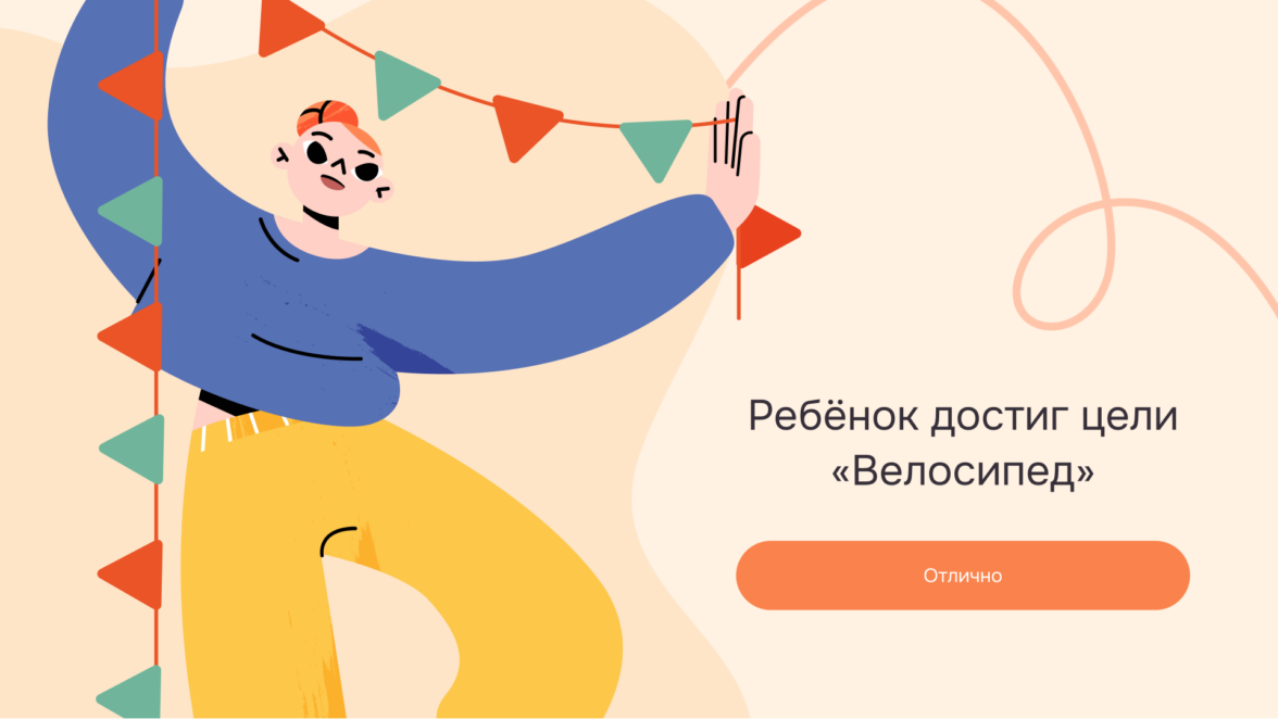 После выполнения всех задач и получения нужного количество баллов, ребенку приходит поздравительное уведомление. Такой же экран видят и родители.