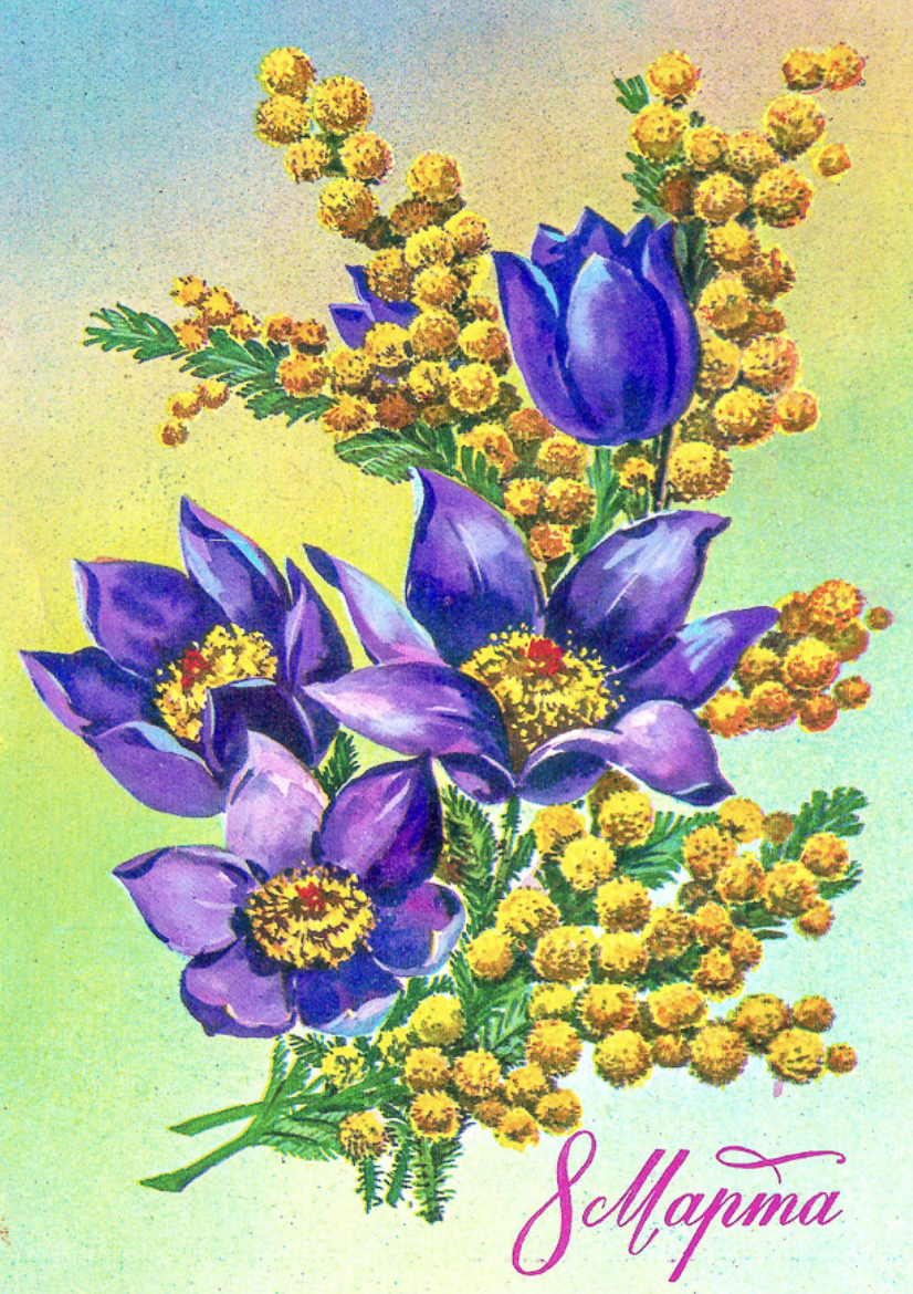 Однако самым настоящим графическим символом праздника становится мимоза — первый весенний цветок. Ее можно увидеть практически на каждой второй открытке того периода.