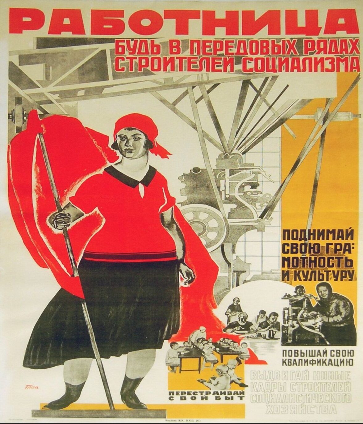 Красный цвет как символ революции.Изображения женщин-тружениц — работниц, колхозниц, врачей, учительниц.