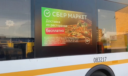 Двусторонние цифровые экраны с диагональю до 65 дюймов установлены в городских автобусах. Ролики воспроизводятся на внутреннем и внешнем экранах: один доступен для пассажиров внутри салонов, другой рассчитан на внешний трафик. Трансляции ведутся в беззвучном режиме. Хронометраж ролика составляет 5 и более секунд.