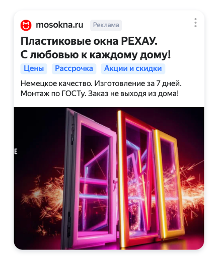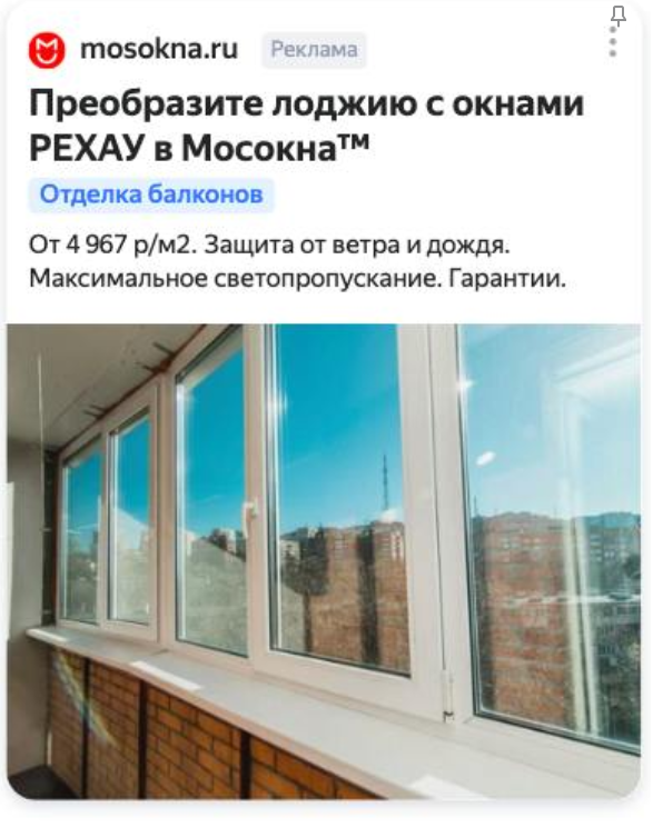 На поиске запущены стандартные кампании по семантике: брендовая кампания, Рехау, кампания с семантикой по балконам и окнам, баннер на поиске, кампания по конкурентам. Вот примеры брендовой РК на поиске и баннера на поиске.