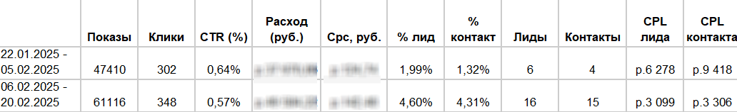 Важно! Так как кампания была только запущена по новому фиду, ей необходимо время на обучение, поэтому целевые метрики по лидам и контактам пока некорректно сравнивать с обученной кампаний по старому фиду. Тем не менее, в марте 2025 мы уже наблюдаем прирост лидов и снижение CPL.
