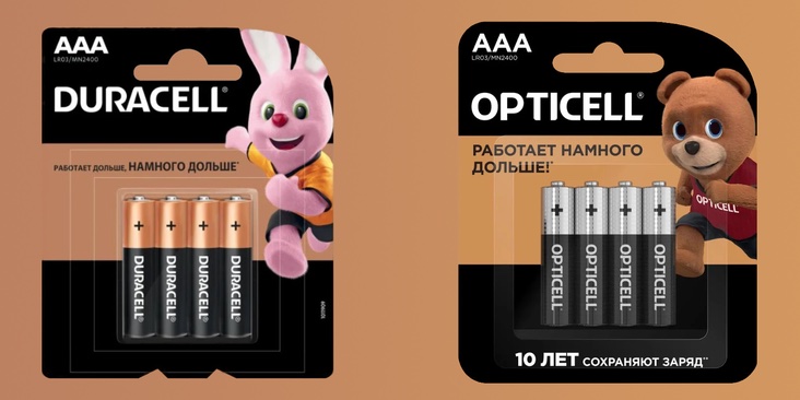 Сходств в брендировании упаковок Duracell и Opticell гораздо больше, чем отличий. Шрифты, цвета, надписи и слоган почти не отличаются. Как и форма упаковки с плавно срезанным правым верхним углом. Медведь Opticell выглядит каким-то усталым по сравнению с зайцем Duracell, зато компенсирует недостаток энергичности обещанием хранить заряд целое десятилетие. Зачем и кому это надо, не объясняет.