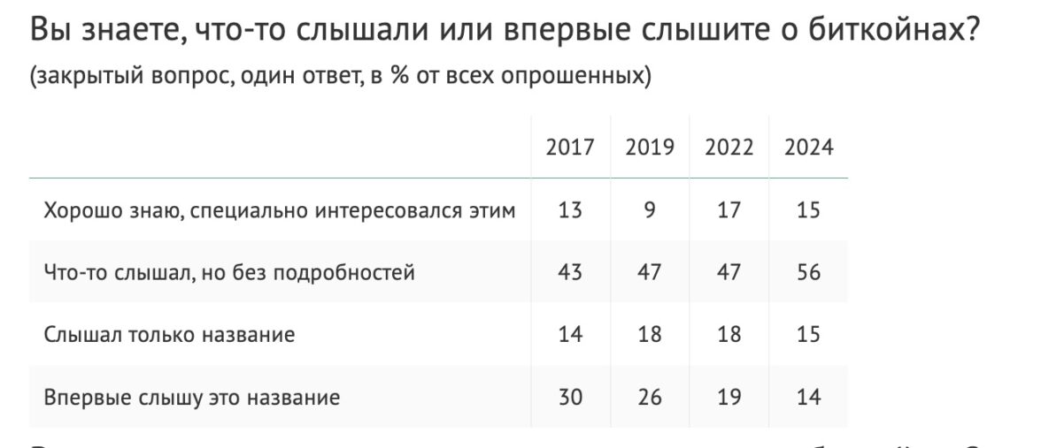 Похожие цифры были получены ВЦИОМ в опросе 2024 года. Знатоков криптовалютной тематики оказалось 15%. Впервые услышали слово биткоин — 14%. Слово слышали, но больше ничего не знают — 15%. Более половины (56%) заявили, что что-то об этом слышали, но не особо знают подробности темы.