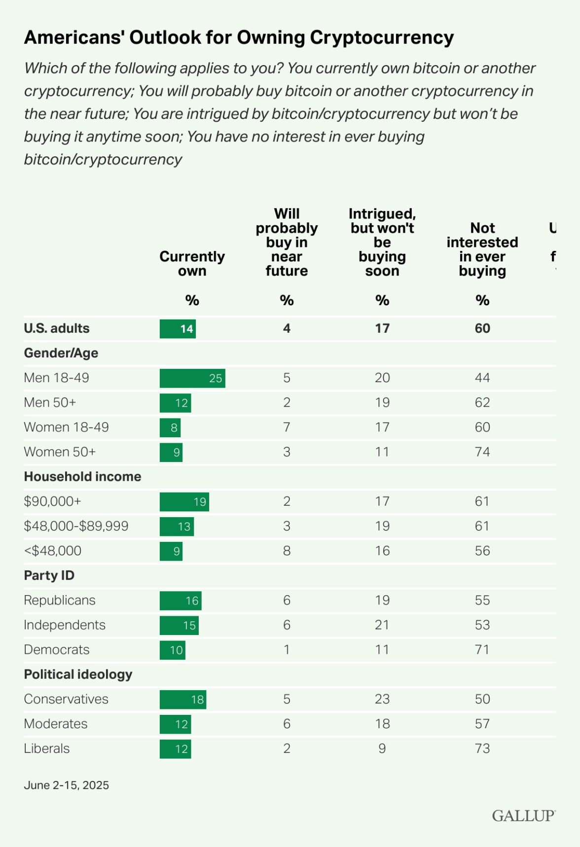Выяснилось, что только примерно один из семи американцев (14%) в настоящее время владеет криптовалютой. Заинтересован покупкой криптовалюты в ближайшем будущем каждый двадцать пятый опрошенный — 4%. Каждый пятый (17%) интересуется, но покупать в обозримом будущем не планирует. Подавляющее большинство (60%) не заинтересовано в покупке криптовалюты. Среди владельцев криптовалюты больше мужчин, чем женщин. Имеет криптовалюты каждый четвертый (25%) мужчина в возрасте от 18 до 49 лет и каждый восьмой (12%) мужчина более старшего возраста. Среди женщин этих возрастных категорий доли обладательниц криптовалюты составляют соответственно 8% и 9%.Вполне логично, что криптовалютой чаще владеют люди с более высоким доходом. Криптовалюта есть в каждом пятом (19%) домохозяйстве с годовым доходом свыше $90 тыс.. Среди домохозяйств с доходом ниже $48 тыс. доля владеющих криптовалютой вдвое ниже — 9%. Республиканцы и консерваторы чаще владеют криптовалютой по сравнению с демократами и либералами.