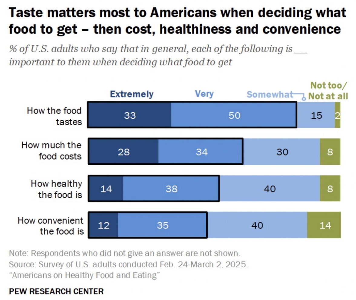 Подавляющее большинство взрослых американцев считает важными все четыре основные характеристики еды (вкус, цена, польза, доступность), но лидирует вкус. Для 83% вкус играет крайне важное значение при выборе еды. Значимость вкуса одинаково высока практически для всех групп населения вне зависимости от пола, возраста и уровня дохода. Во всех подгруппах не менее 70% придают вкусу первостепенное значение.