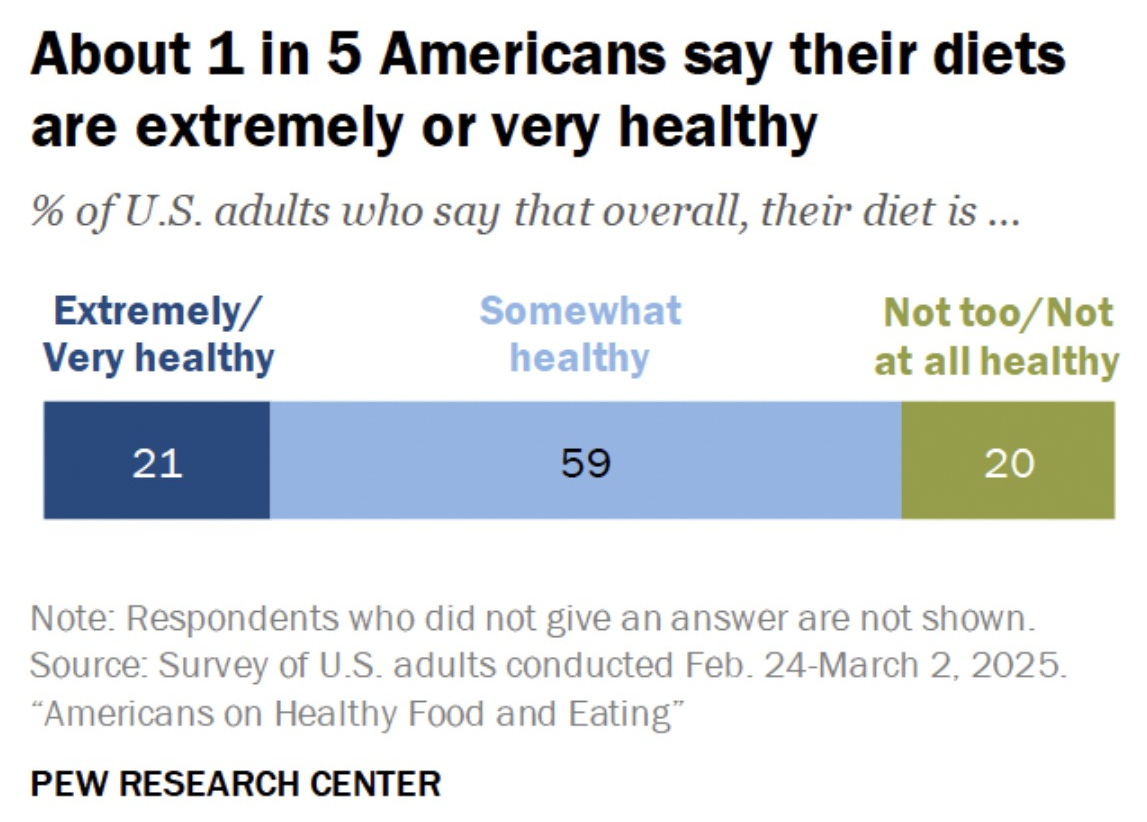 Американцы довольно сдержанно оценивают качество своей диеты. 59% респондентов считают её умеренно здоровой. Значительно меньше тех, кто называет свое питание исключительно или очень здоровым (21%). Каждый пятый признает, что его рацион либо недостаточно здоровый, либо вовсе вредный.