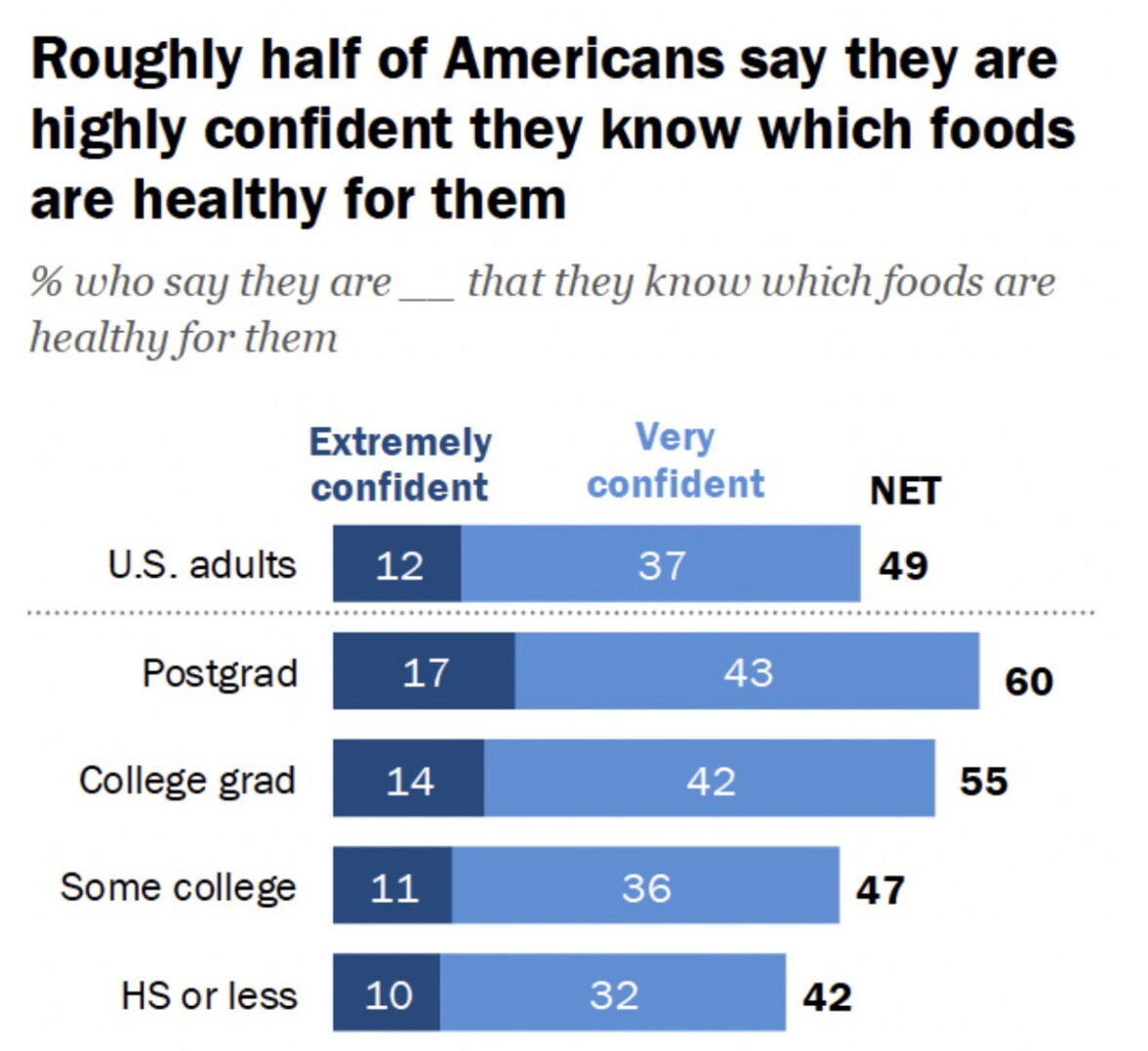 При этом респонденты с высшим образованием считают, что лучше разбираются в принципах здорового питания по сравнению со среднеобразованными. Например, обладатели степени магистра или доктора наук на 18% чаще заявляют о высокой уверенности в своих знаниях о правильном питании. У окончивших колледж этот показатель составляет всего 42%.