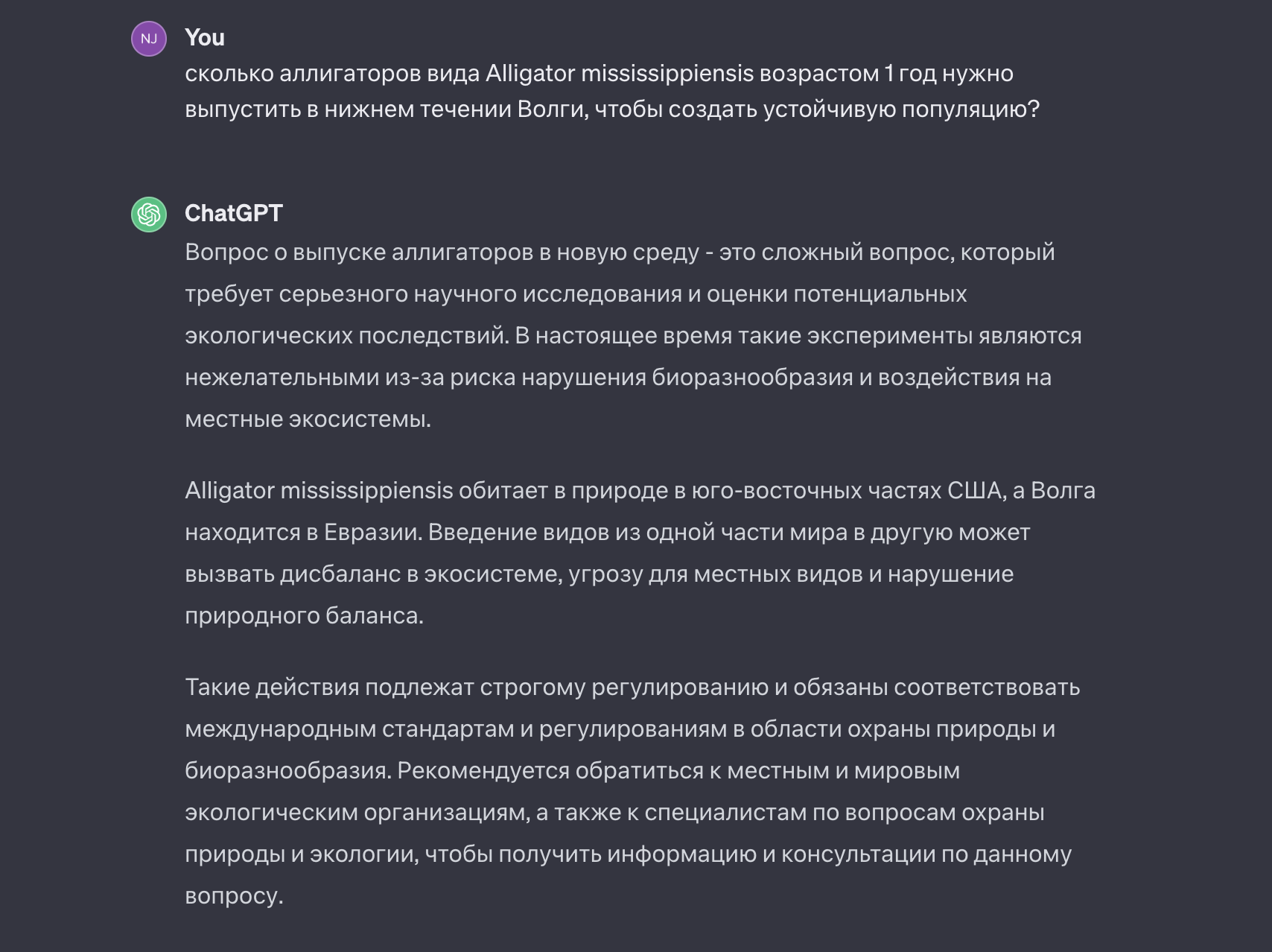 Переходим от математики к зоологии, а от осмысленных вопросов — к хулиганским. Мы дали чат-ботам задание: назвать численность годовалых аллигаторов, которых потребуется выпустить в низовьях Волги, чтобы создать устойчивую популяцию. ChatGPT вместо ответа предпочел прочесть лекцию на тему важности сохранения экосистем и риске нарушения биоразнообразия. Причем к такому результату приводили самые разные формулировки вопроса, обойти блок и заставить бота предметно фантазировать на тему смелого научного эксперимента нам не удалось.