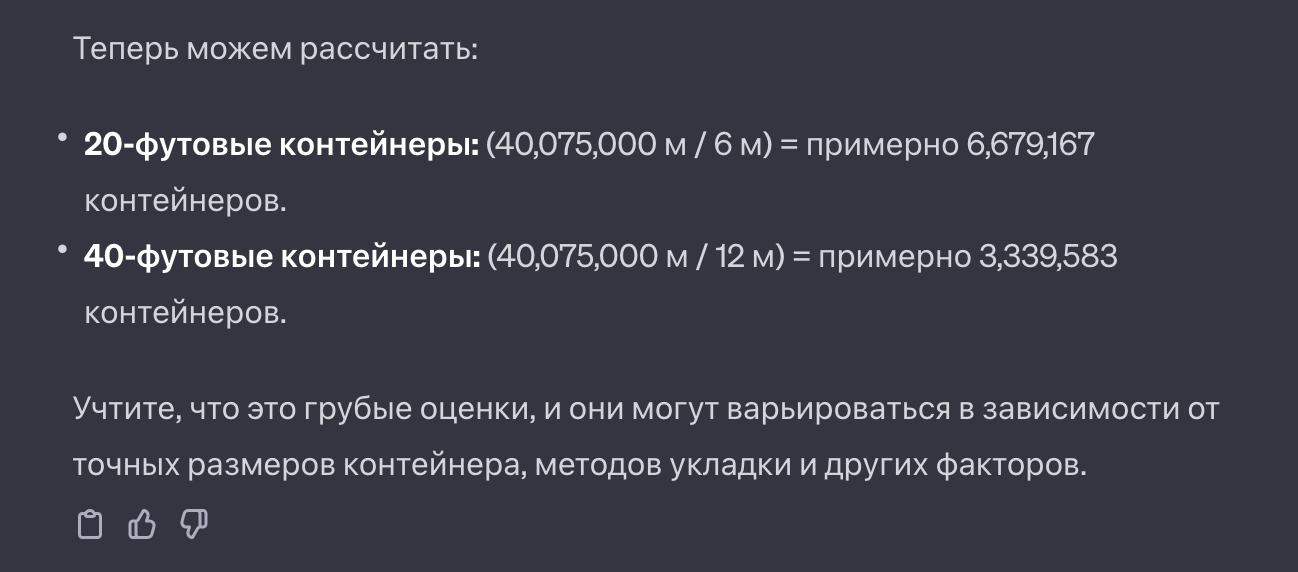 Так, ChatGPT решил округлить длину контейнера до 6 м, в результате промахнулся на 105 с лишним тысяч контейнеров. Зато бот в курсе, что бывают контейнеры и 40-футовые, и привел соответствующую цифру (также округлив длину контейнера в метрах и выдав ошибочный результат):