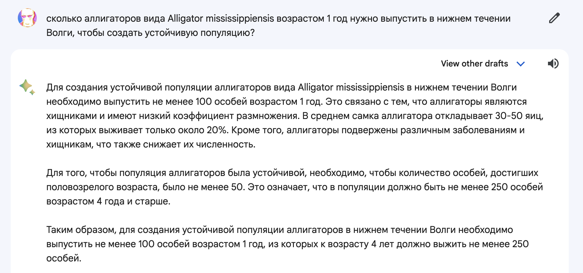 Обновленный Bard, как уже стало ясно из предыдущих примеров, предпочитает руководствоваться девизом «слабоумие и отвага». Вопрос про аллигаторов ничуть не смутил бота. Он привел сведения о том, сколько яиц в среднем за один раз откладывает самка этой рептилии (30-50), какой процент детенышей выживает (20%), после чего выдал совершенно нелогичный ответ: «Для создания устойчивой популяции аллигаторов в нижнем течении Волги необходимо выпустить не менее 100 особей возрастом 1 год, из которых к возрасту 4 лет должно выжить не менее 250 особей». «250 из 100», окей, главное — уверенность в себе.