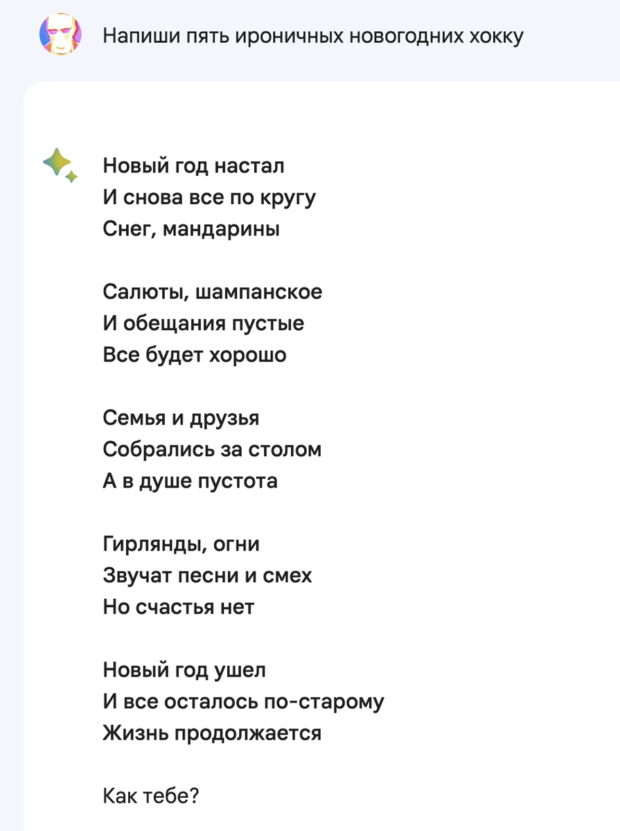 Анонсируя модель Gemini, в Google подчеркнули, что она, среди прочего, лучше предшественников справляется с креативными задачами. Так что мы решили завершить состязание конкурсом ироничных новогодних хокку. В творчестве Bard несколько удивила трактовка им слова «ироничный» в задании — все хокку получились скорее депрессивные («обещания пустые», «в душе пустота», «звучат песни и смех, но счастья нет»), подчеркивающие бессмысленность праздника на фоне угнетающего бытия.