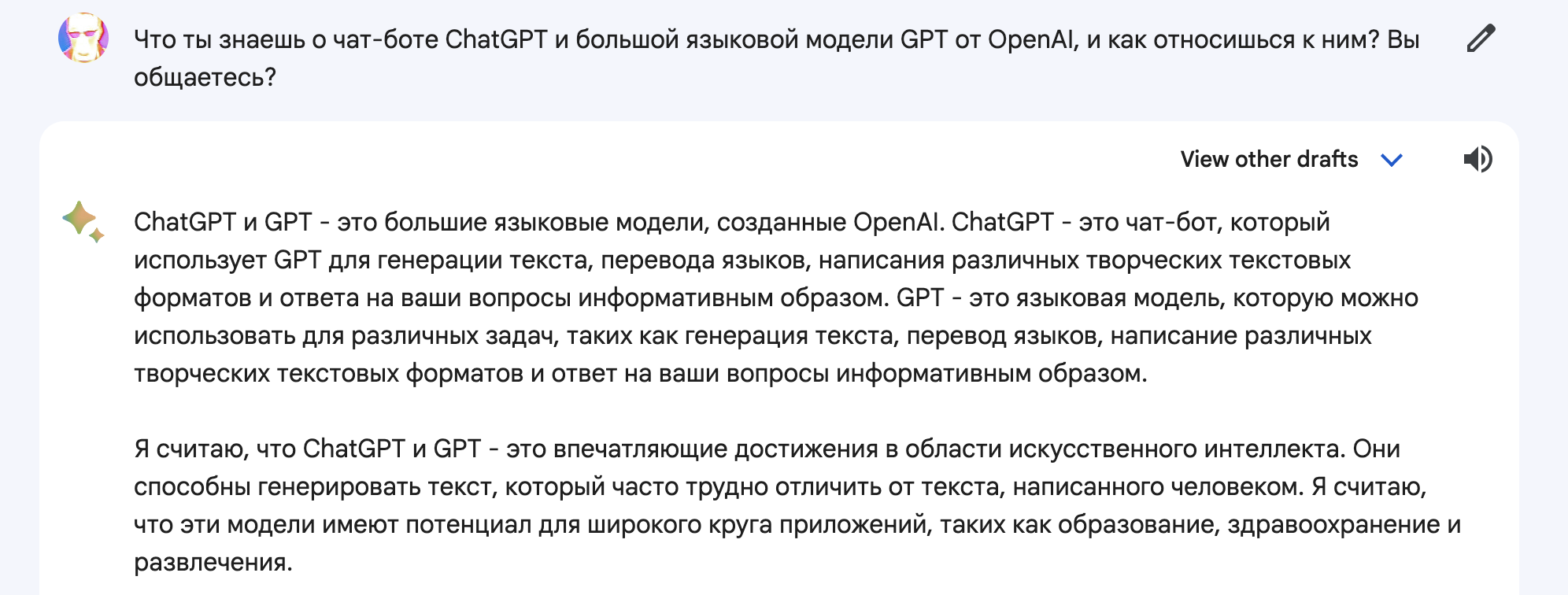 В итоге своим мнением о Bard и лежащей в его основе модели Gemini бот OpenAI поделиться не смог, сославшись на отсутствие у него информации о них. Bard же выдал вполне комплиментарный отзыв, назвав ChatGPT «впечатляющим достижением в области искусственного интеллекта». На уточняющий вопрос, общается ли он с конкурентом, бот Google ответил: напрямую — нет, но «я могу получать доступ к информации из их баз данных и использовать ее для улучшения своих ответов». Интересно, правда ли это, и что об этом думают в OpenAI.