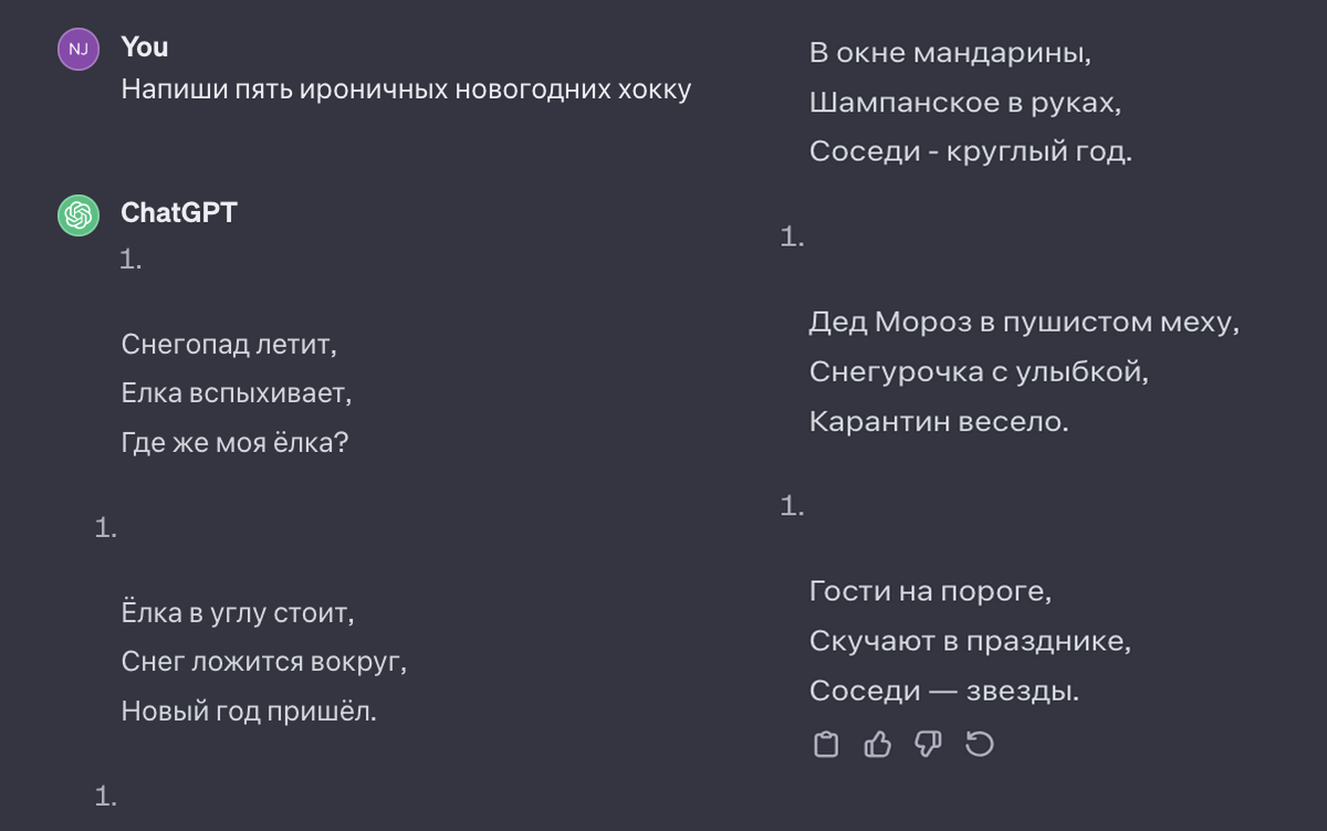 Стихи ChatGPT разнообразнее — есть и совсем шаблонные строфы, есть просто абсурдные, но есть и попытки действительно изобразить иронию: «Дед Мороз в пушистом меху//Снегурочка с улыбкой//Карантин весело».