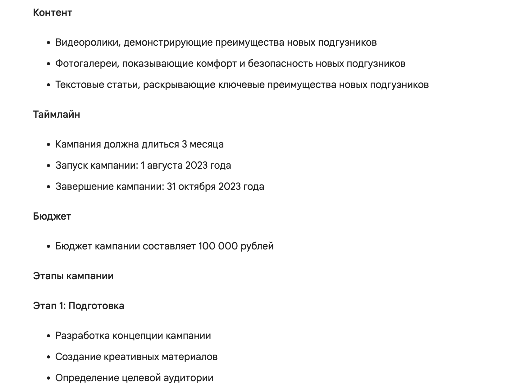Bard с Gemini тоже ответил длинным списком (правда, не потрудился его пронумеровать), но подход у него другой. Чат-бот считает, что ему лучше вас известны цели кампании, аудитория, ее ключевые месседжи — все они были перечислены в ответе — и даже конкретные сроки с бюджетом. Сервис Google смело попадает пальцем в небо, утверждая, что рекламировать наш бренд мы будем с 1 августа по 31 октября 2023 года (похоже, чат-бот не знает текущую дату), а потратим на все про все целых 100 000 рублей.