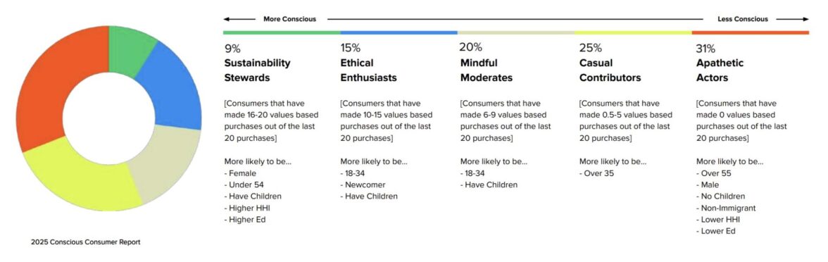 В докладе Public Inc., основанном на результатах опроса 3000 совершеннолетних жителей США и Канады, авторы условно выделили пять типов потребителей в зависимости от их приверженности к философии осознанного потребления.