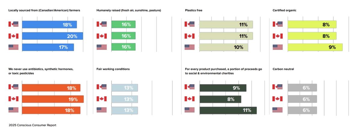 В результате была определена первая восьмерка самых важных для потребителей заявлений бренда. Очень важными оказались патриотические соображения. Продукт должен быть выращен фермером из своей страны (синий цвет на рисунке). Это важно для 20% канадцев и 17% американцев. 19% канадцев и 18% американцев думают о том, как покупать экологично, и обращают внимание на то, чтобы фермеры не использовали антибиотики, гормоны и пестициды (красный цвет). По 16% потребителей в обеих странах высказались за гуманное содержание домашних животных (зеленый цвет). По 13% респондентов в обеих странах высказались за справедливые условия труда для работников, сделавших то, что они покупают (голубой цвет). 11% жителей Канады и 10% жителей США выступают против пластика (кремовый цвет). 8% канадцев и 11% американцев радуются, если часть денег, потраченных ими на покупку, пойдет на благие, социально ответственные цели (черный цвет). 8% канадцев и 9% американцев предпочитают органические продукты (салатовый цвет). По 6% респондентов в обеих странах поддерживают углеродно-нейтральное производство (серый цвет).