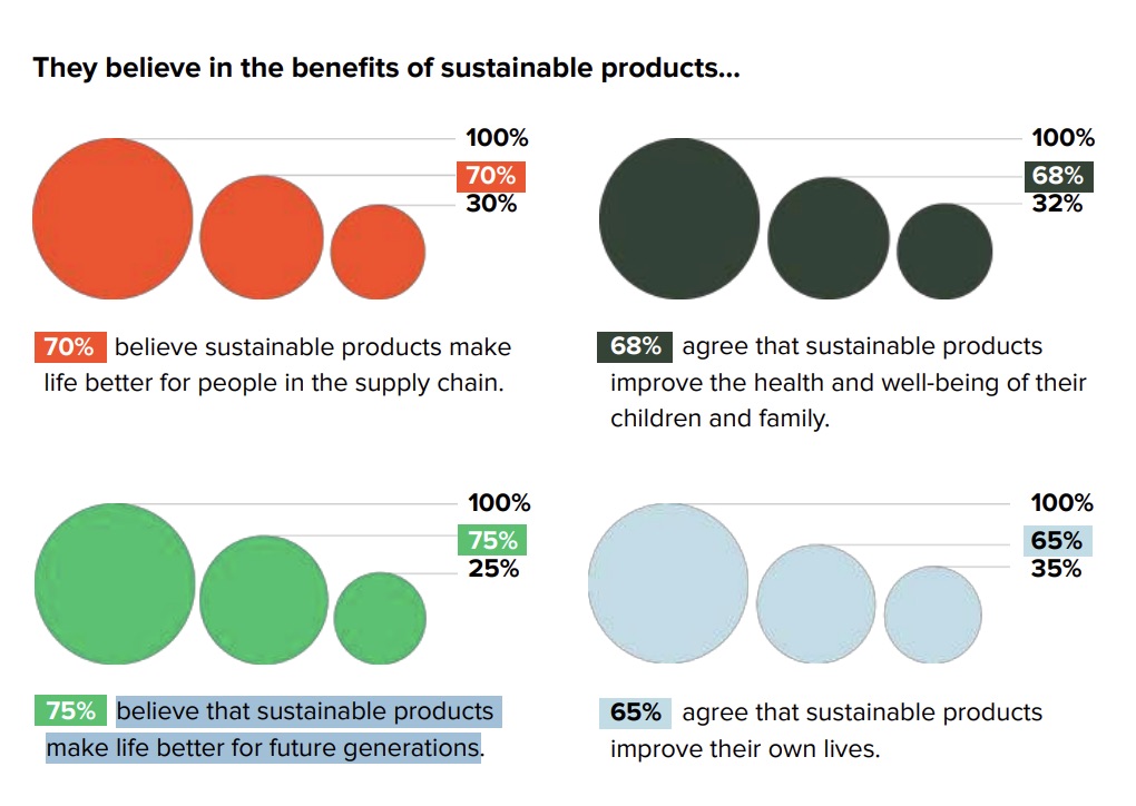 70% верят, что устойчивые продукты делают жизнь людей в цепочке поставок лучше (красный цвет на рисунке). 68% согласны с утверждением, что продукты, произведенные в соответствии с принципами устойчивого развития, улучшают здоровье и благополучие их семьи (черный цвет). 75% верят, что такие продукты делают жизнь лучше для будущих поколений (зеленый цвет), а 65% — что они улучшают их собственную жизнь (светло-голубой цвет).