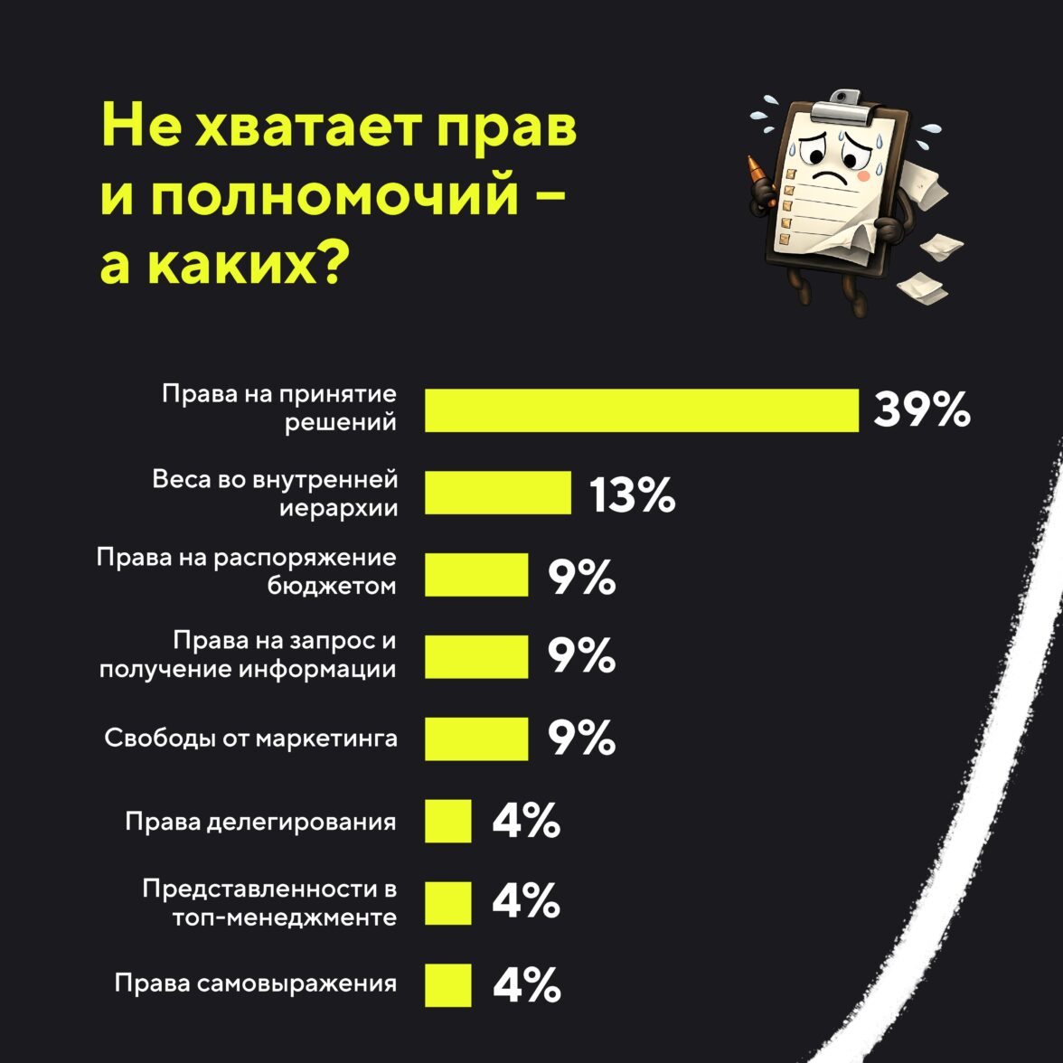 Коммуникаторы также указали на нехватку прав распоряжаться бюджетом (9%), ограниченный доступ к необходимой информации (9%) и зависимость от решений маркетинговых отделов (9%).